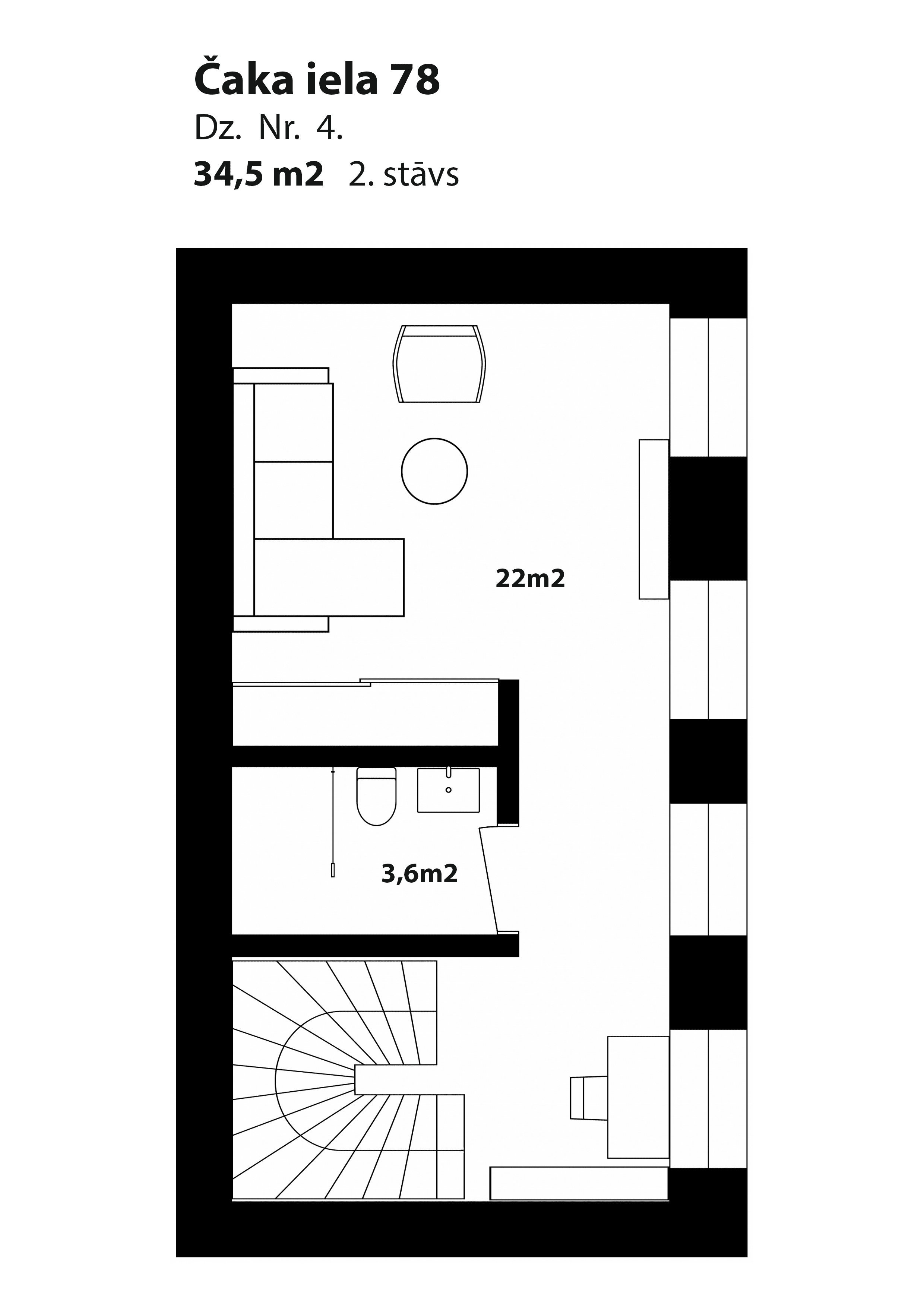 Dzīvoklis izceļas ar pārdomātu plānojumu un mūsdienīgu, dizainera radītu interjera koncepciju. Tiek piedāvāta pilna apdare ar augstas kvalitātes materiāliem – jau uzstādīta santehnika (Villeroy & Boch), kā arī iebūvēti apgaismes risinājumi. Griestu augstums līdz 3,5 metriem piešķir telpai plašuma un gaismas sajūtu.