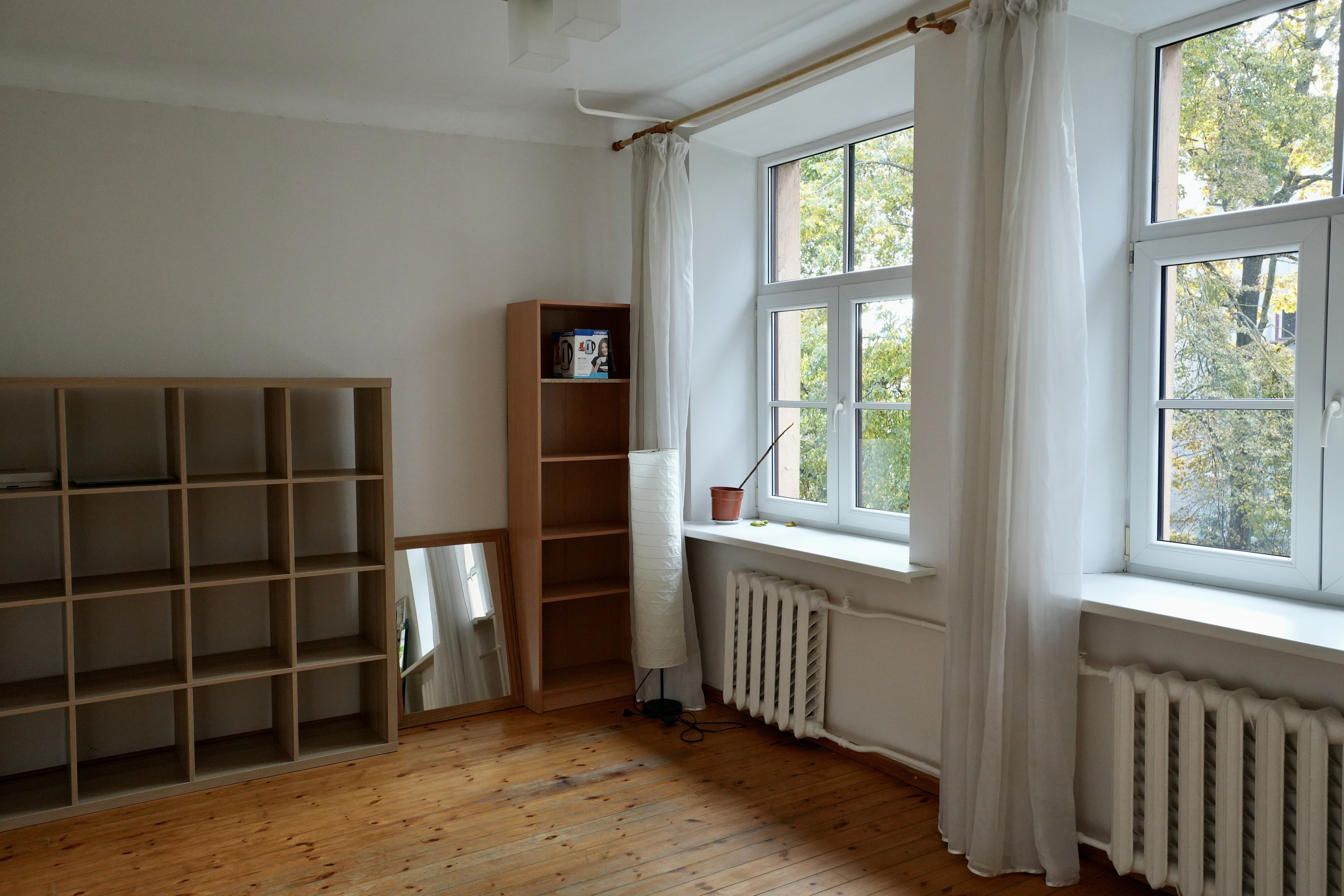 Pa istabas logu paveras skats uz Bīskapa gāti, pa virtuves un otras istabas logu - pagalms.