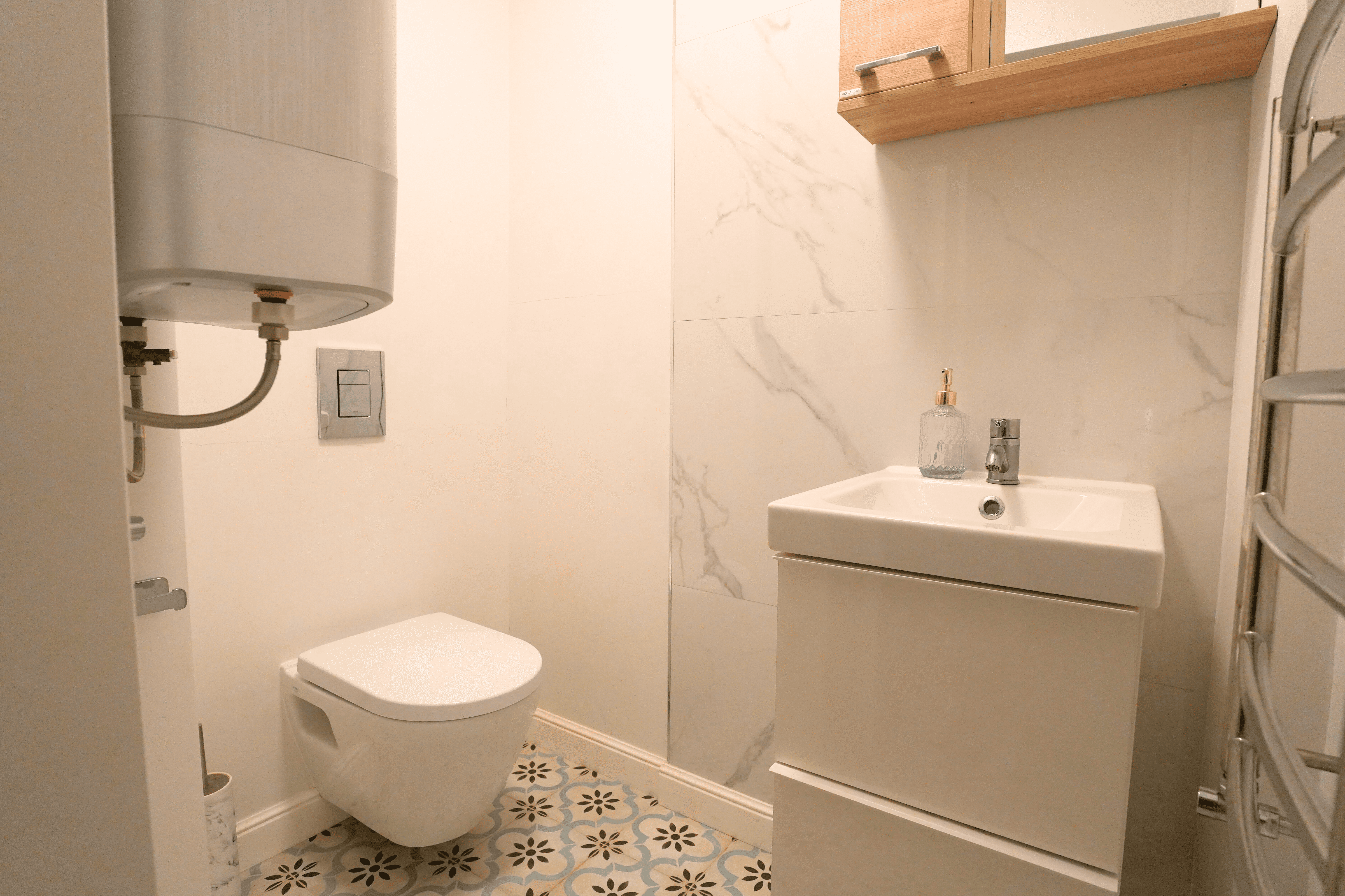 Dzīvoklim ir centrālā apkure, un vietām arī elektriski apsildama grīda. Komunālie vasarā sasniedz apmēram 100 eur, un ziemā 200 eur.