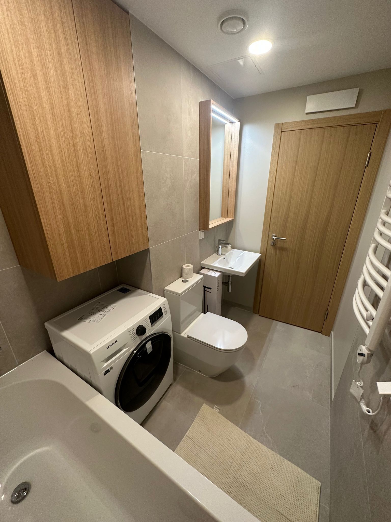 Dzīvoklis ir pilnībā mēbelēts un gatavs dzīvošanai. Viesistaba apvienota ar virtuves zonu, kas aprīkota ar tehniku- ledusskapi, plīti, tvaika nosūcēju, trauku mašīnu. Izolēta guļamistaba. Vannas istaba ar veļas mašīnu, žāvētāju un siltajām grīdām.