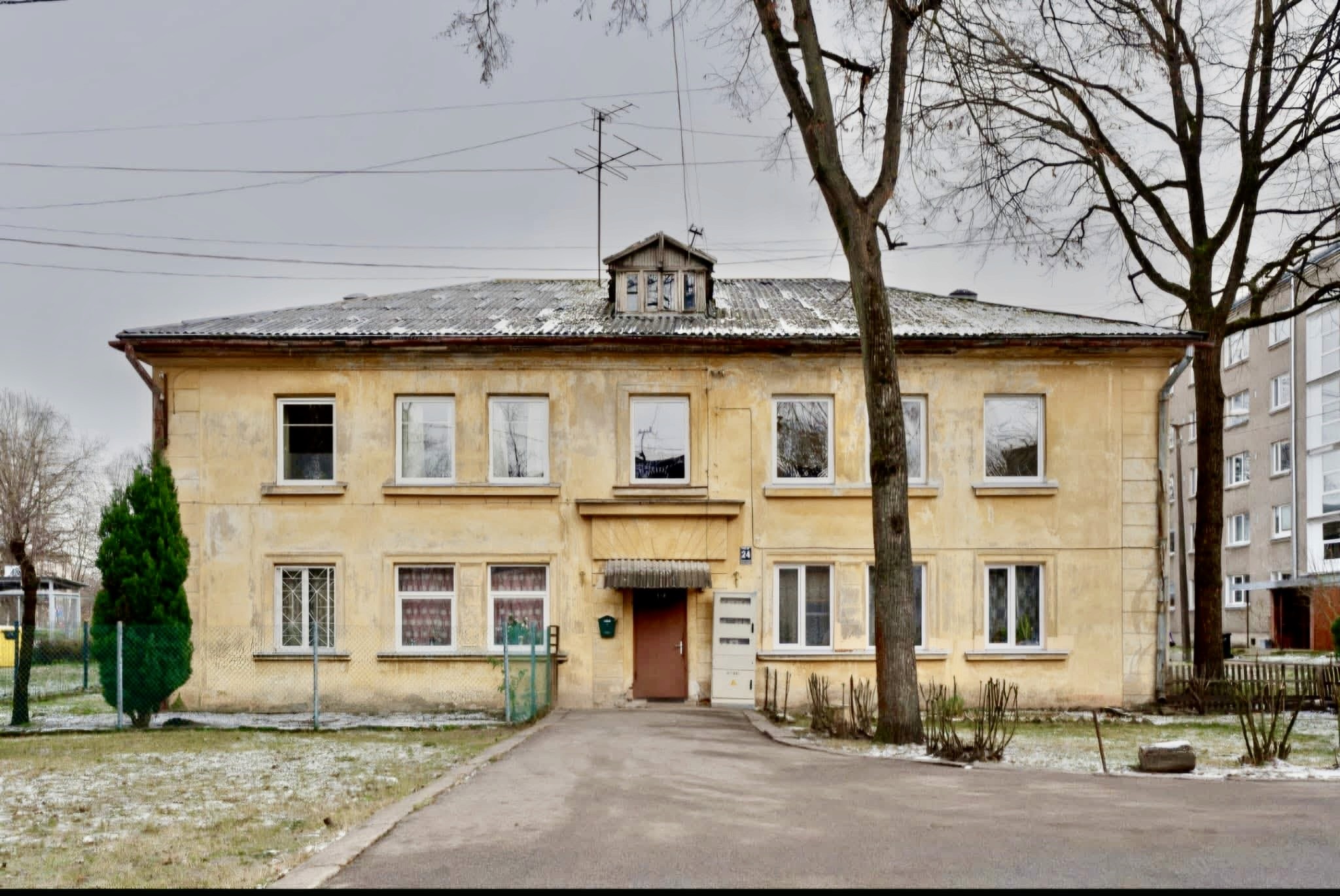 Māja atrodas klusā, sakoptā pagalmā ar iespēju novietot automašīnu pie ēkas.