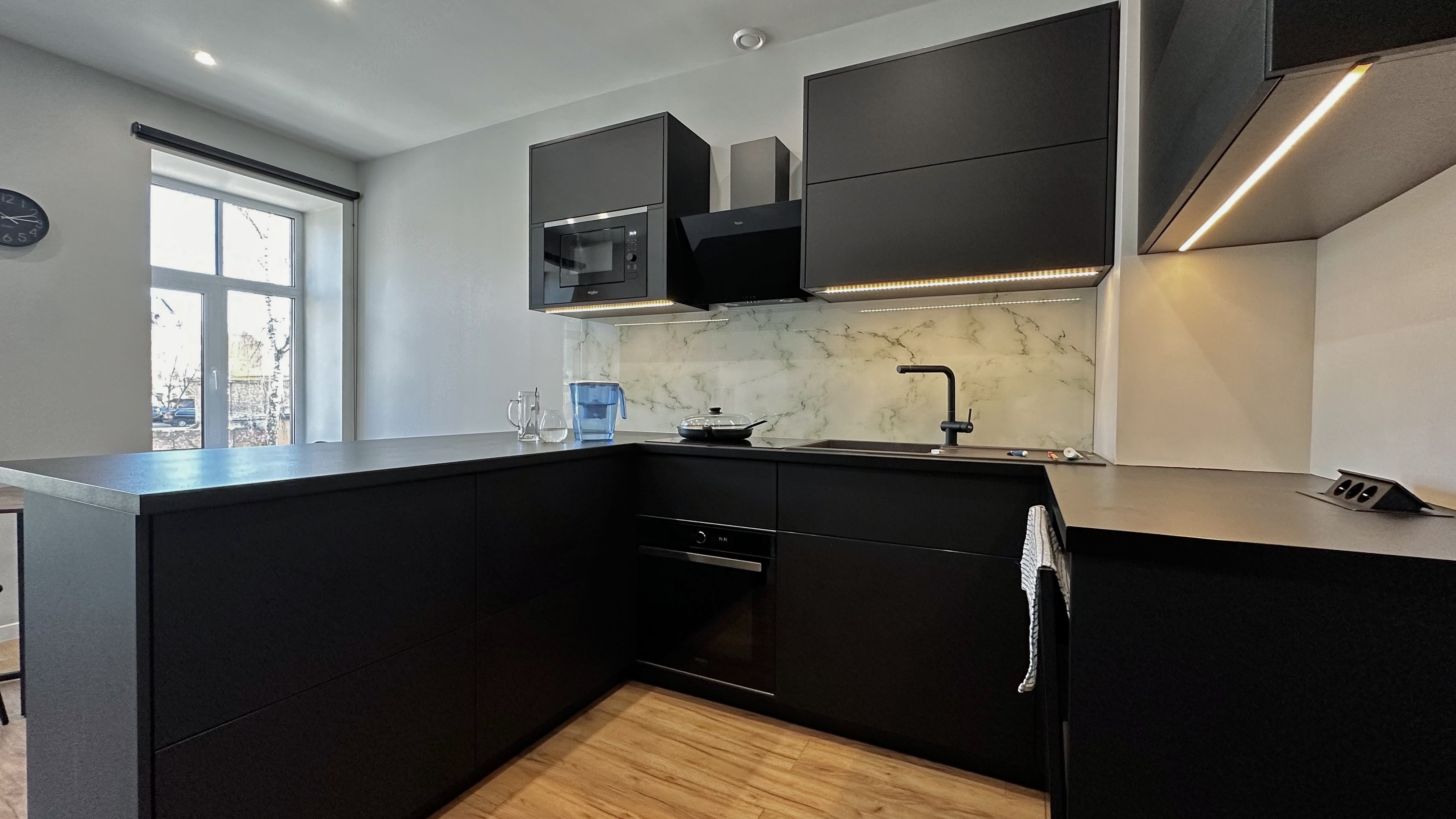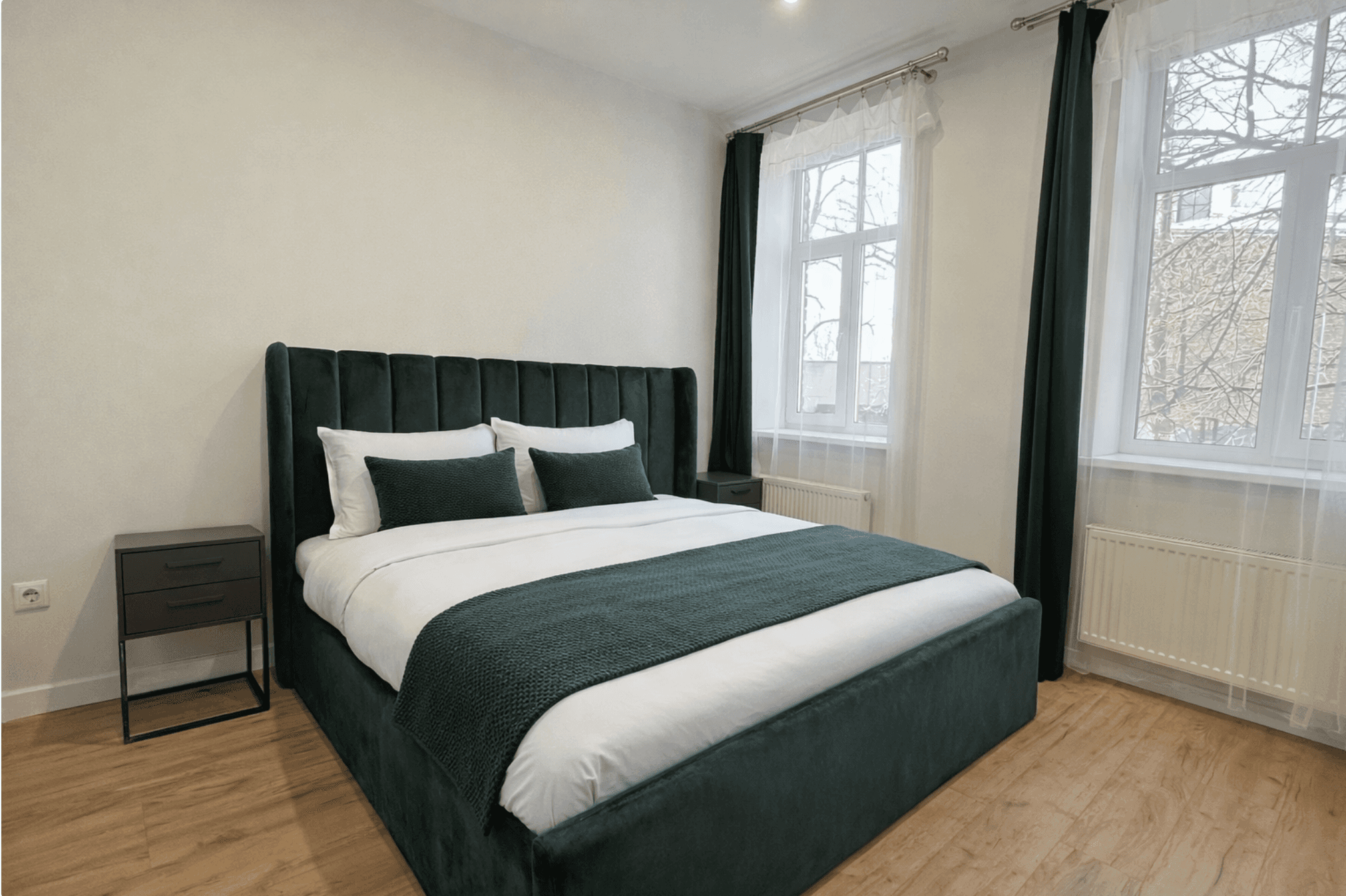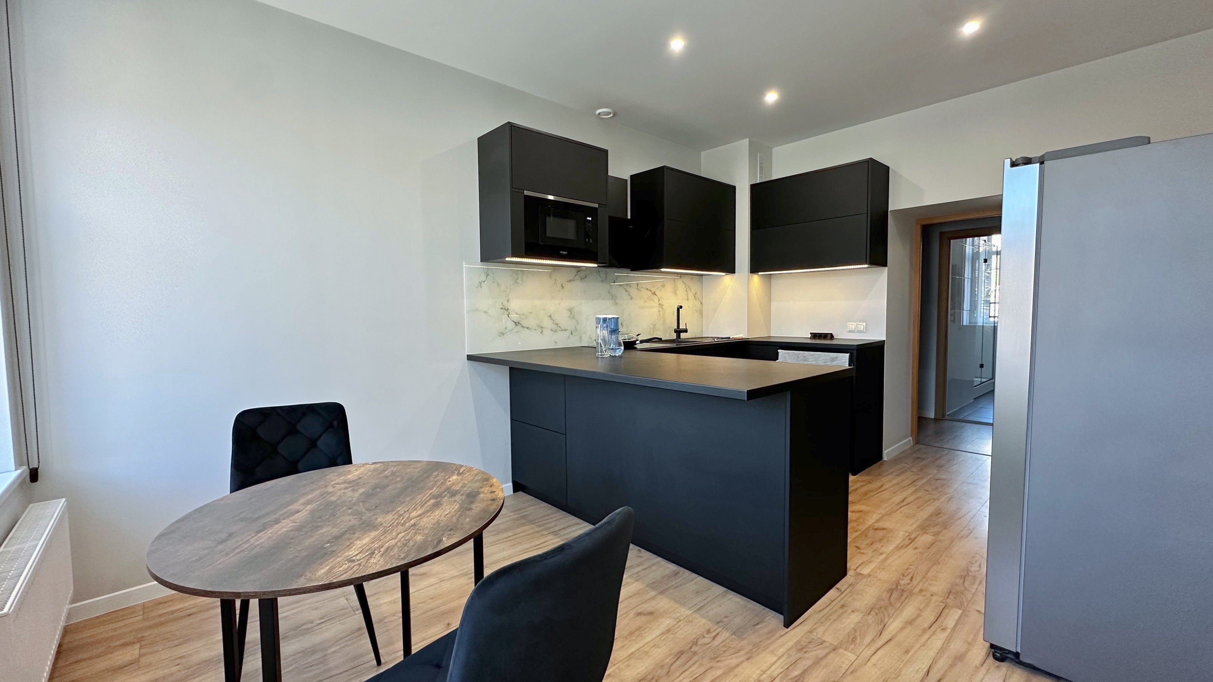Dzīvoklī ir divas guļamistabas, no kurām viena ir pilnībā mēbelēta. Otra guļamistaba nav mēbelēta, taču pus-istabā ir liels skapis un darba galds. Virtuve aprīkota ar jaunāko sadzīves tehniku - trauku mazgājamā mašīna, cepeškrāsns, mikroviļņu krāsns, divdurvju ledusskapis, indukcijas plīts, tvaika nosūcējs. Vannasistabā ir veļasmašīna un žāvētājs, kā arī liela duša.