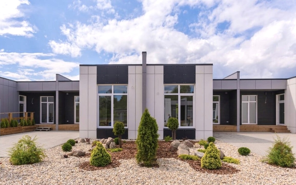 Living area – 90 m², terrace – 25 m², private garden – 100 m². Parking spaces for two cars are available next to the house.