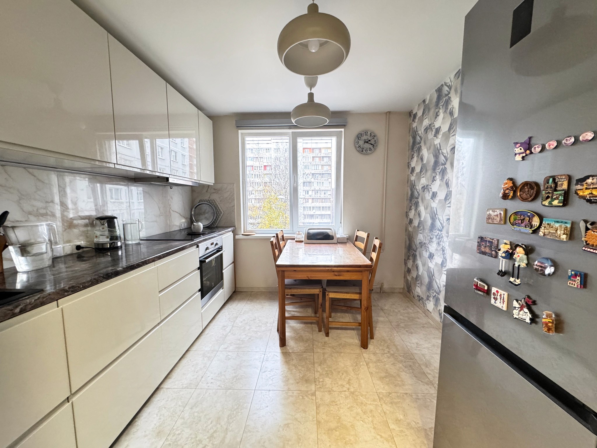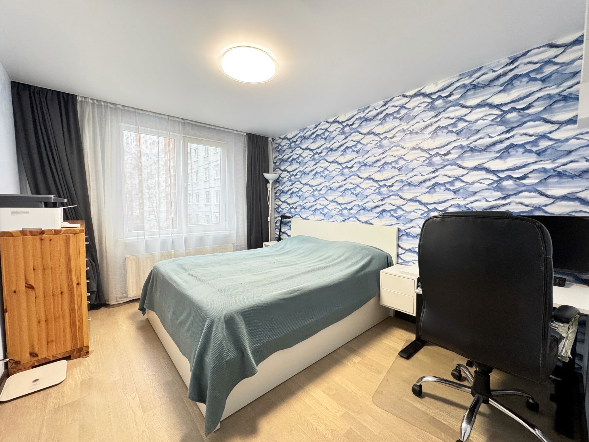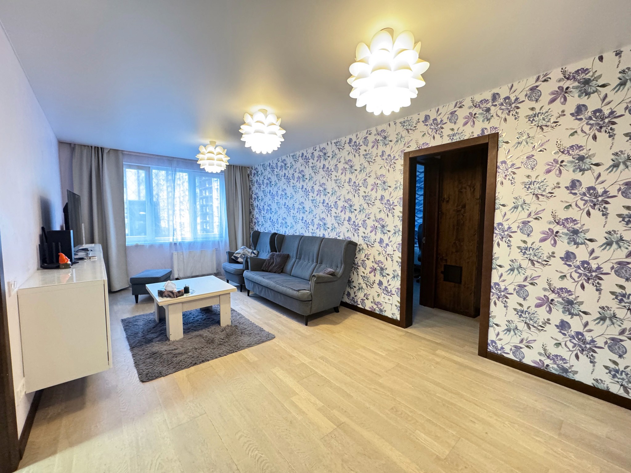 Dzīvoklī ir viesistaba, virtuve, kurā ir ledusskapis, plīts, tvaika nosūcējs, cepeškrāsns un trauku mazgājamā mašīna. Ir trīs izolētas guļamistabas un divi sanmezgli, vienā veļas mazgājamā mašīna un vanna. Priekšnamā ir iebūvēts skapis.