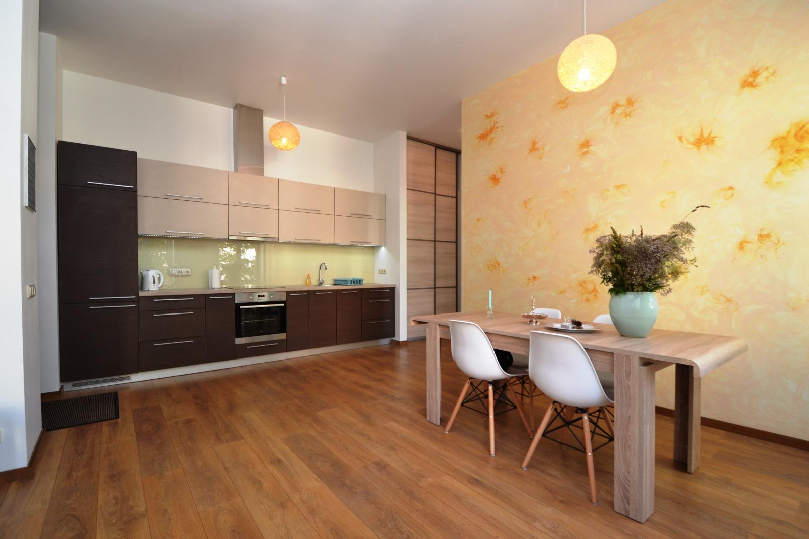 Dzīvokļa plānojums ir pārdomāts un funkcionāls – plaša viesistaba apvienota ar virtuves zonu, atsevišķa guļamistaba, vannas istaba un priekšnams. Lieli logi nodrošina daudz dabiskās gaismas un patīkamu atmosfēru visas dienas garumā. Interjerā dominē neitrāli toņi un koka grīda, kas rada mājīguma sajūtu.