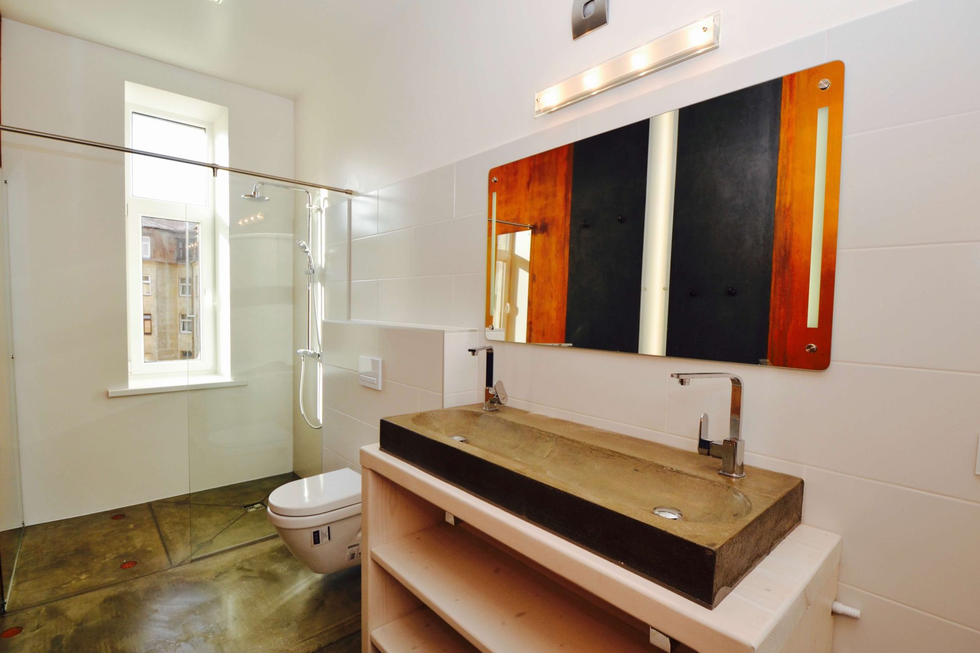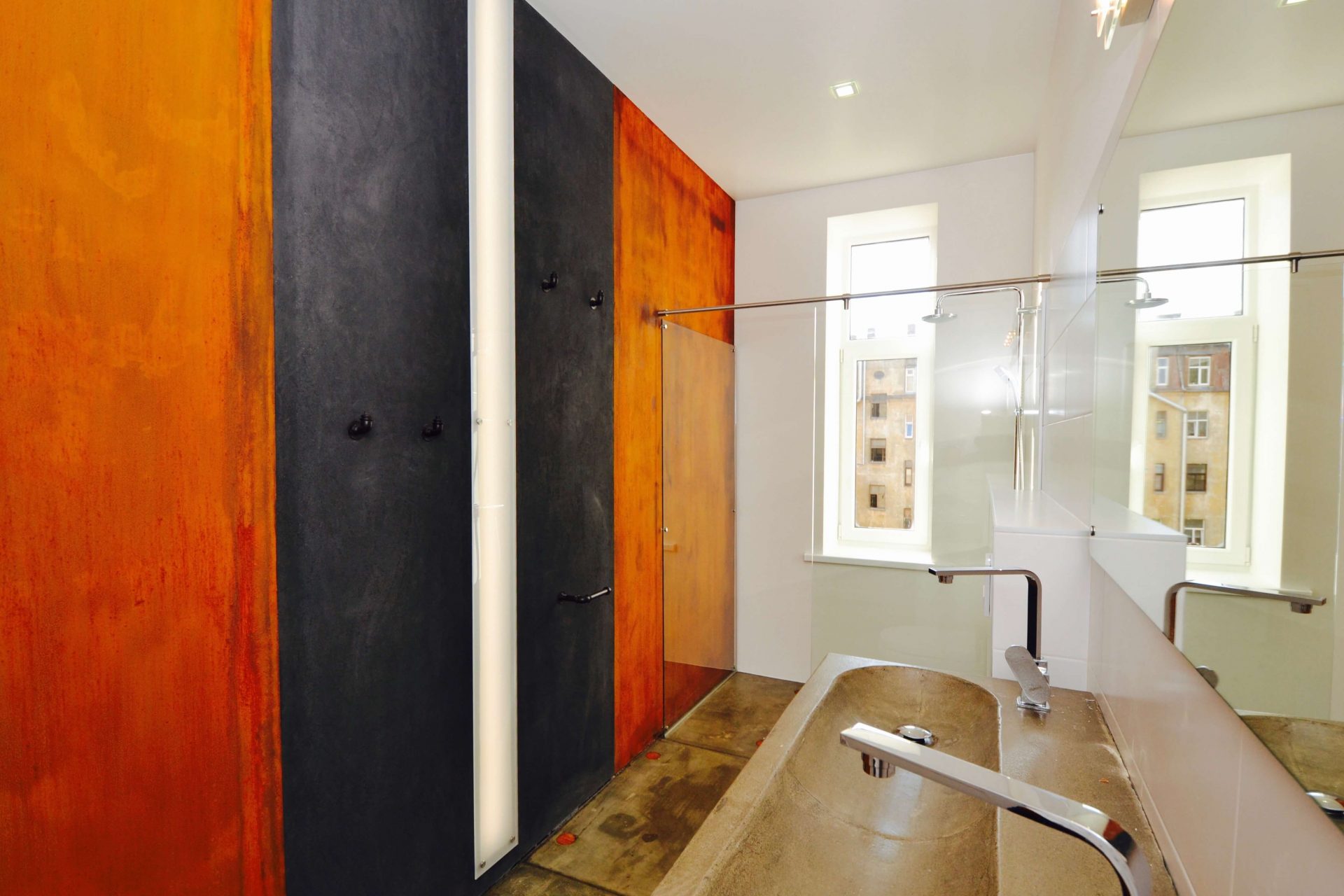 A large part of the design elements were handmade. We constructed the lamps ourselves, the curtains were crocheted, we poured concrete tiles and sinks, etc.