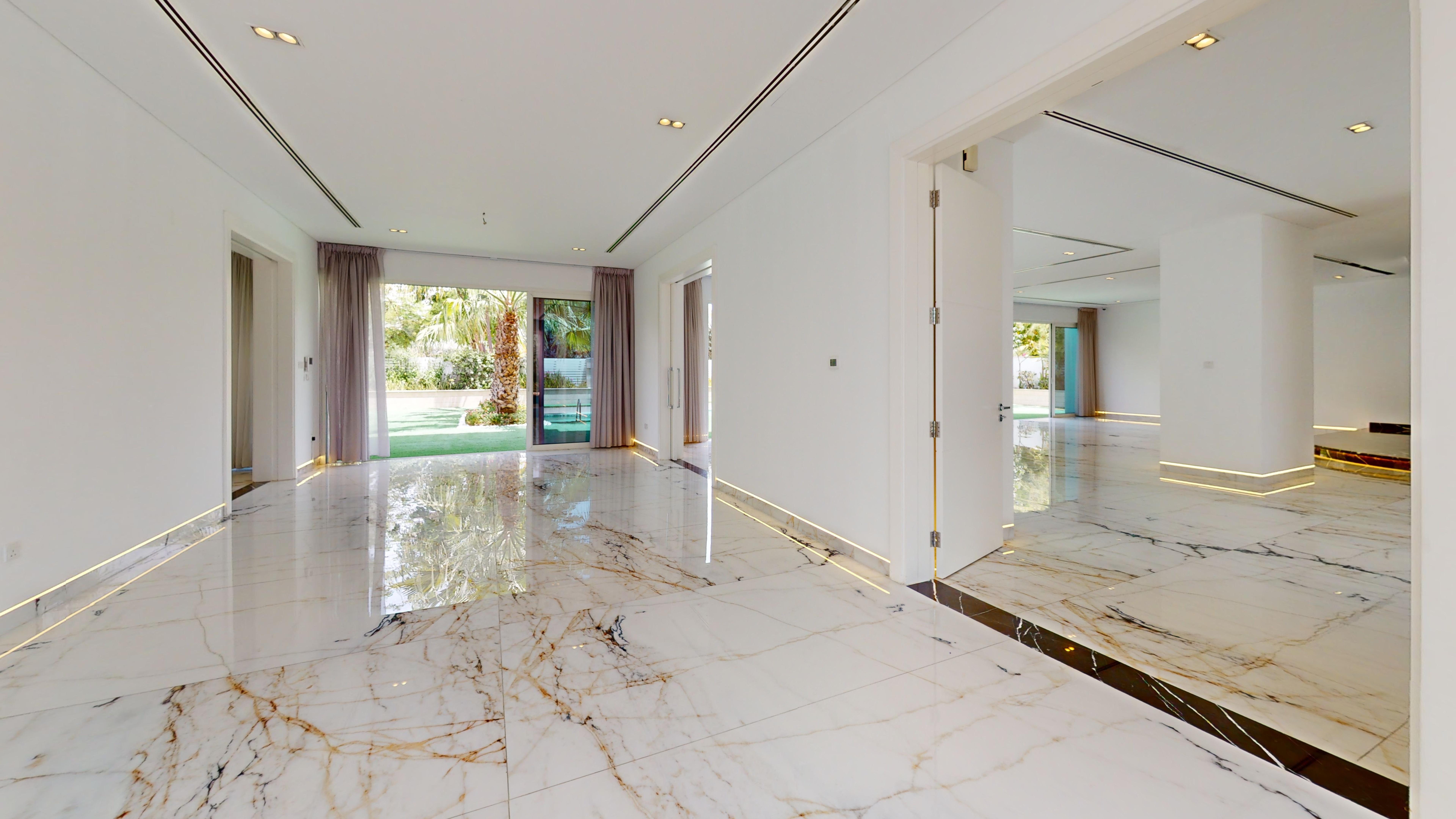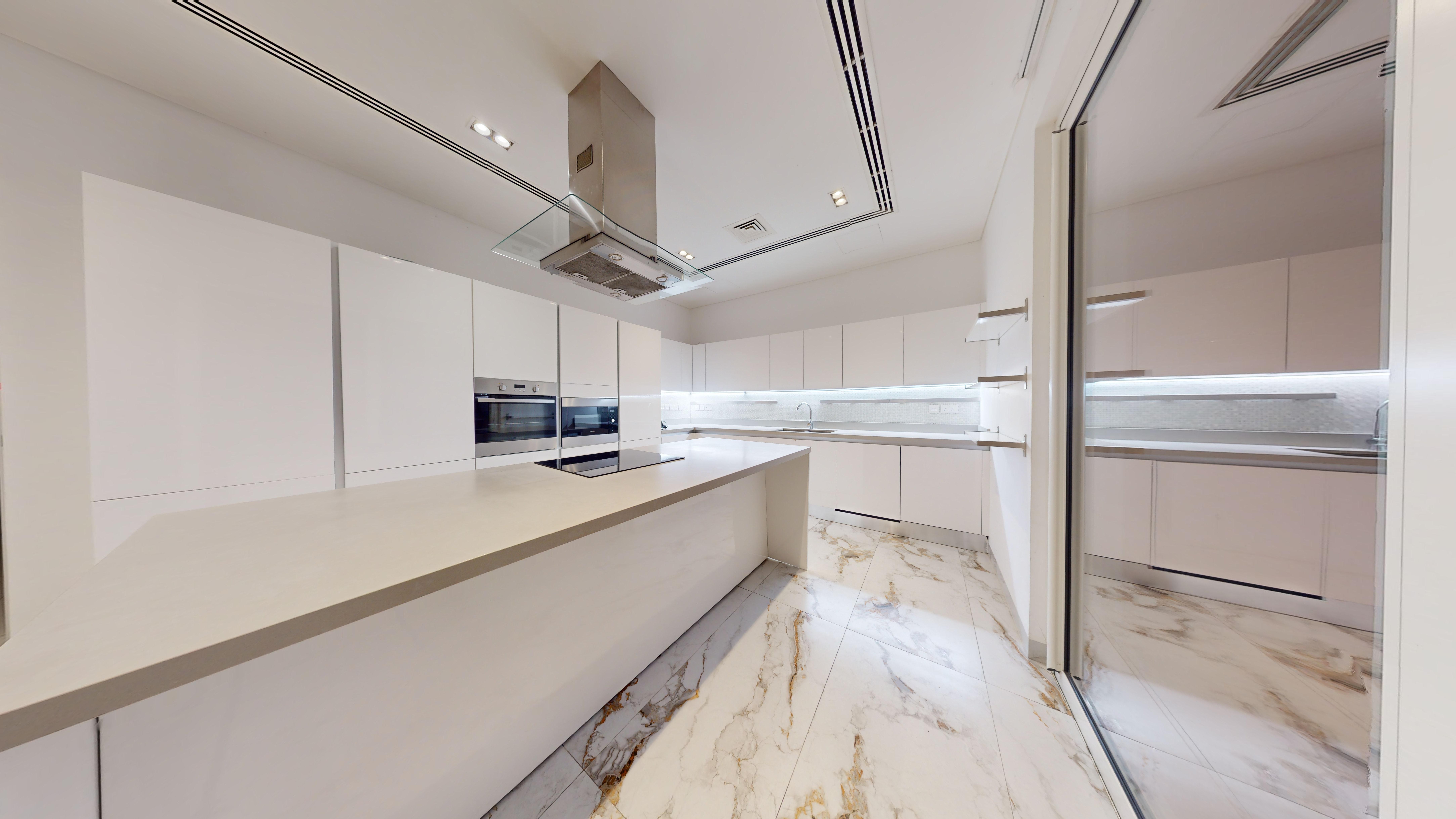 The interior is dominated by light, neutral colours combined with high-quality marble imitation flooring and wall finishes, creating a luxurious yet harmonious atmosphere. The kitchen area is designed in a contemporary minimalist aesthetic with accent lighting.