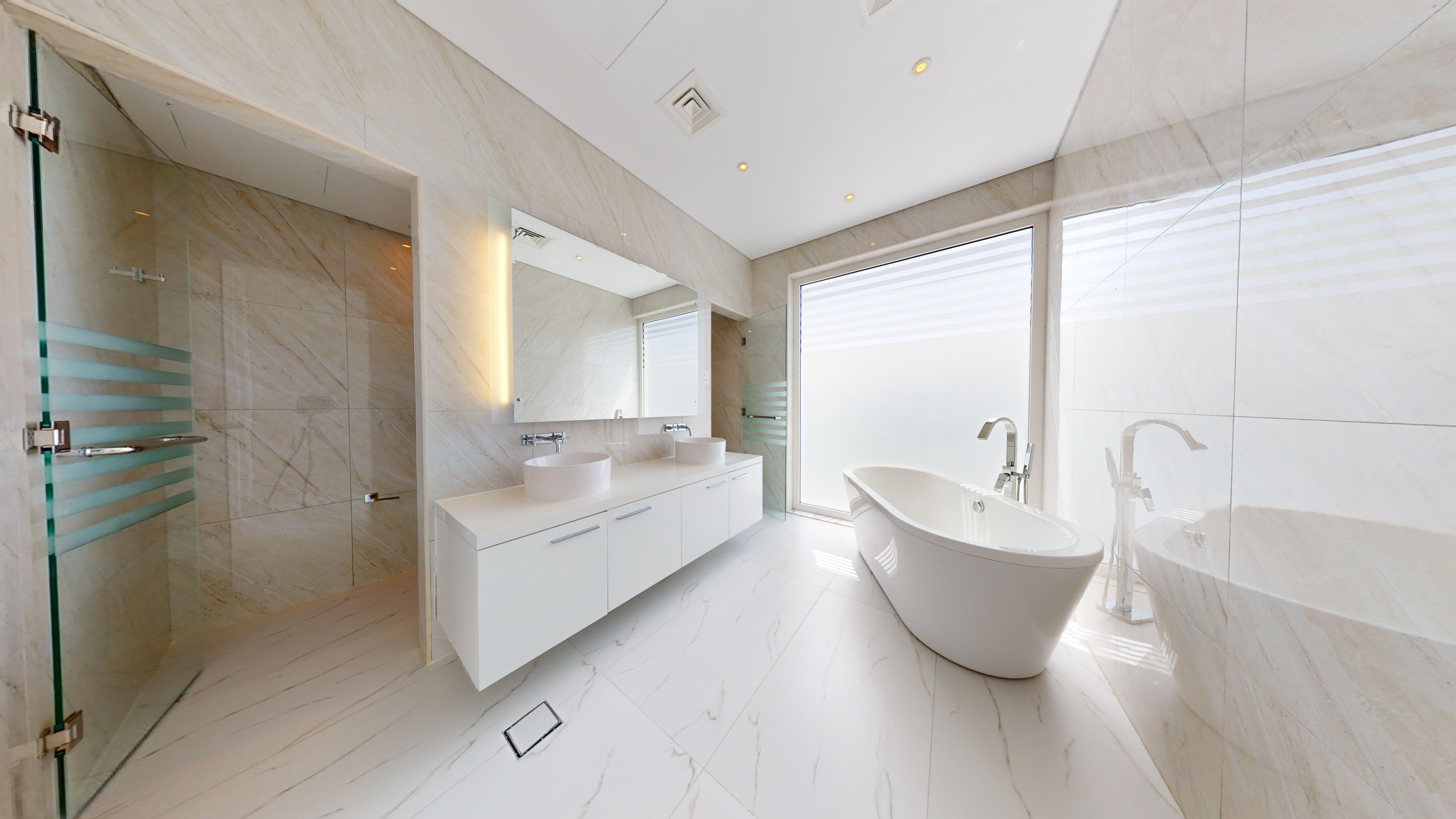 The spacious bathroom features light natural stone textures, complemented by modern sanitary ware and a large mirror surface that visually expands the space.