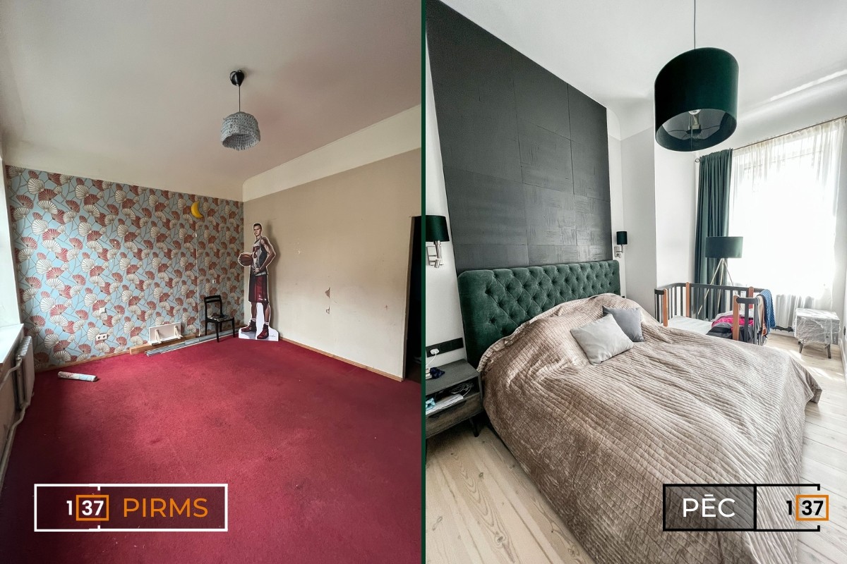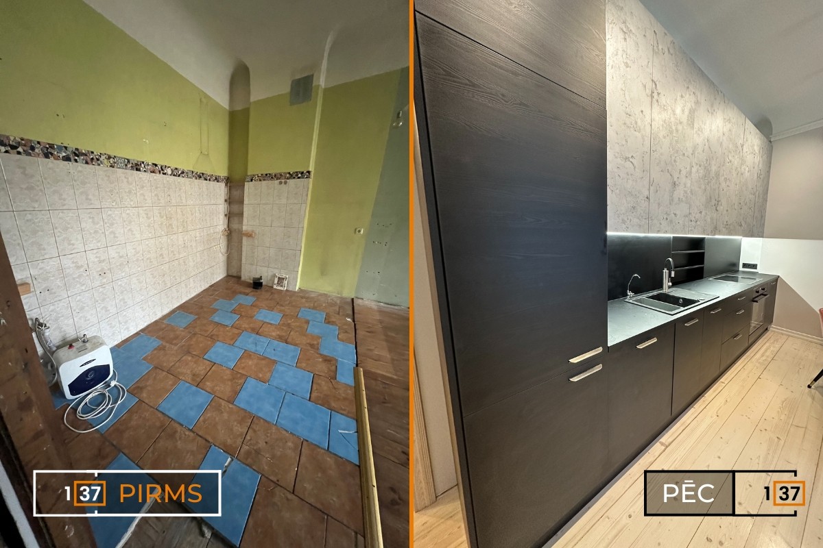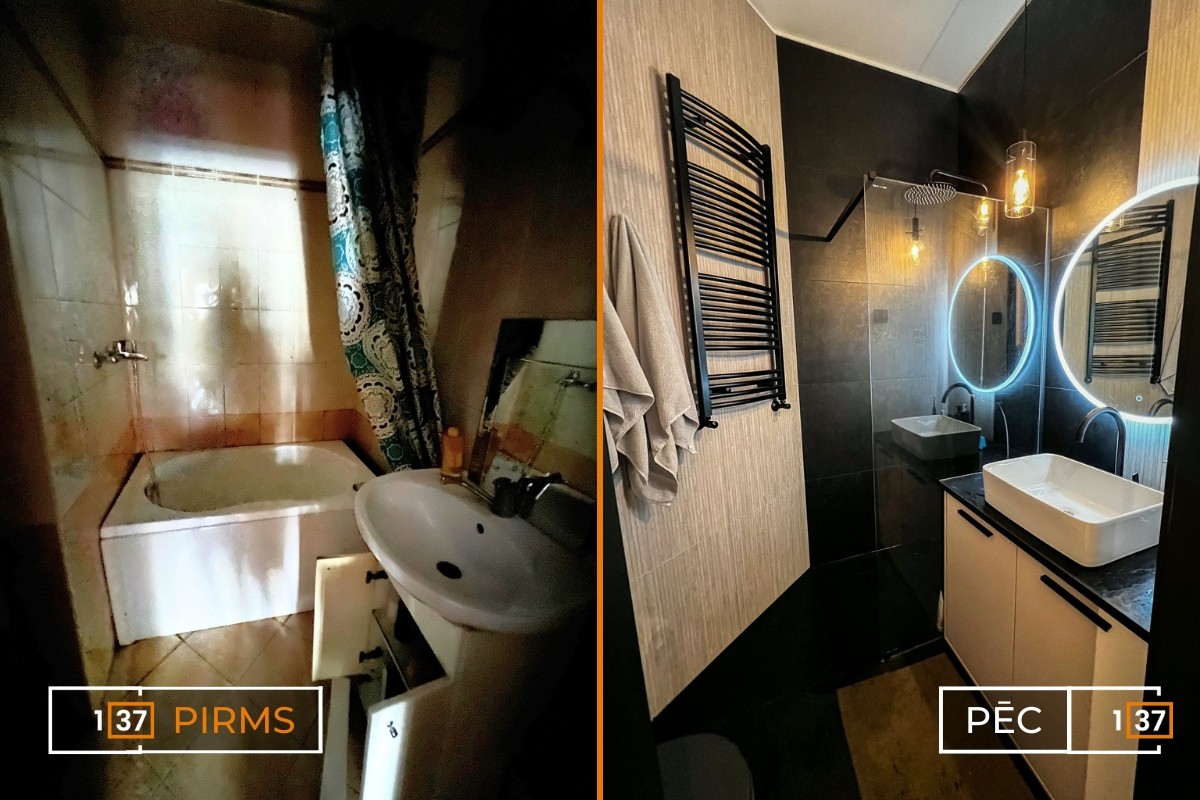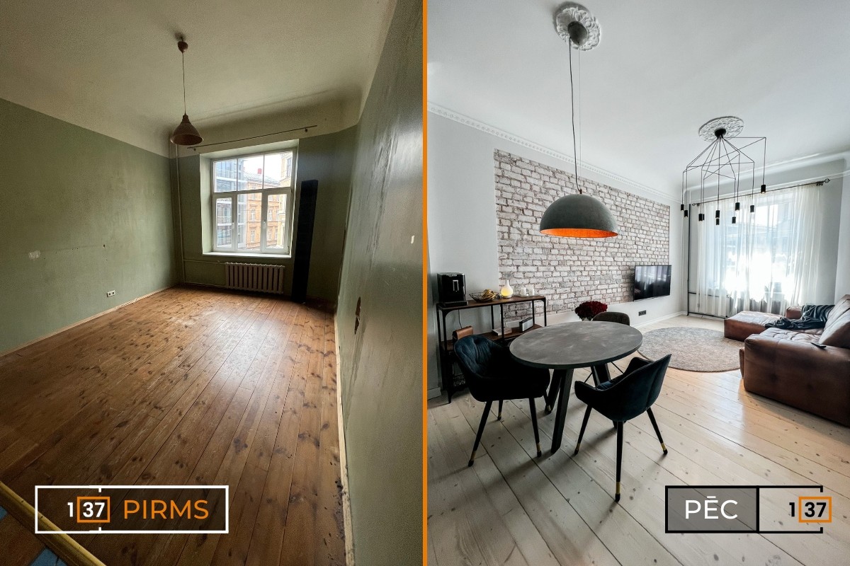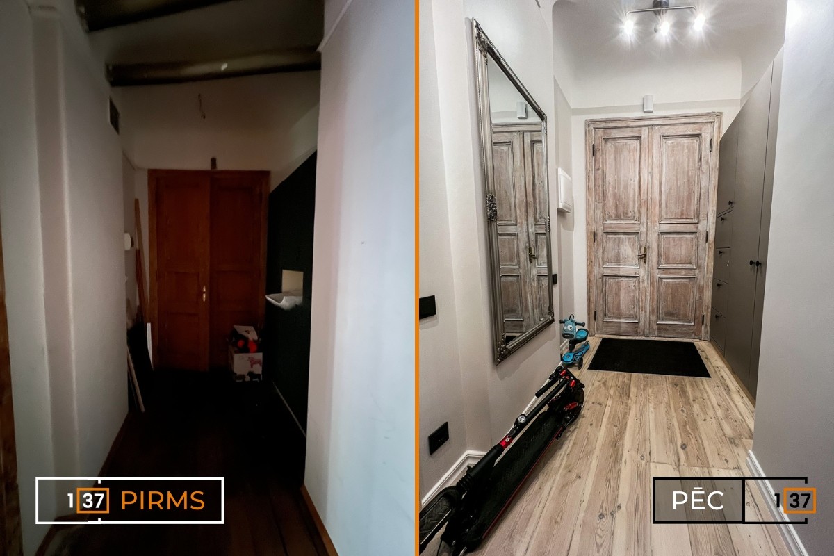 The apartment has been revitalized after a major renovation, gaining a fresh look and a modern design. The apartment layouts were created from scratch, restored, and adapted to modern aesthetics. Particularly noteworthy is the brick wall in the kitchen, which has been kept as an original accent element. To create a sense of warmth and coziness, warm-toned accent lighting has been used, while cooler tones have been applied in areas requiring brighter lighting.