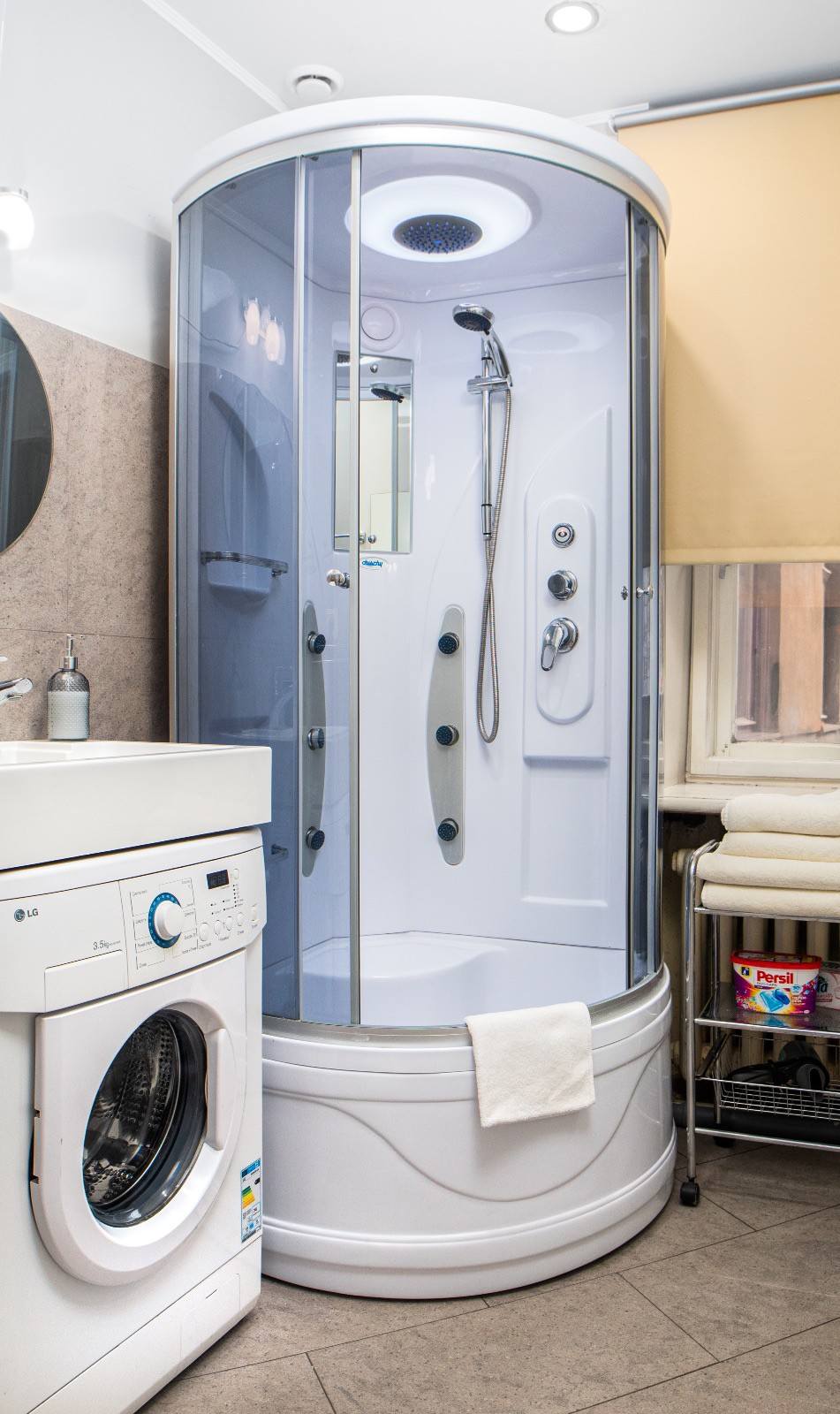 The apartment features a living room and a separate bedroom. It is furnished and equipped with all necessary household appliances. The bathroom includes a shower and a washing machine, as well as a separate toilet.