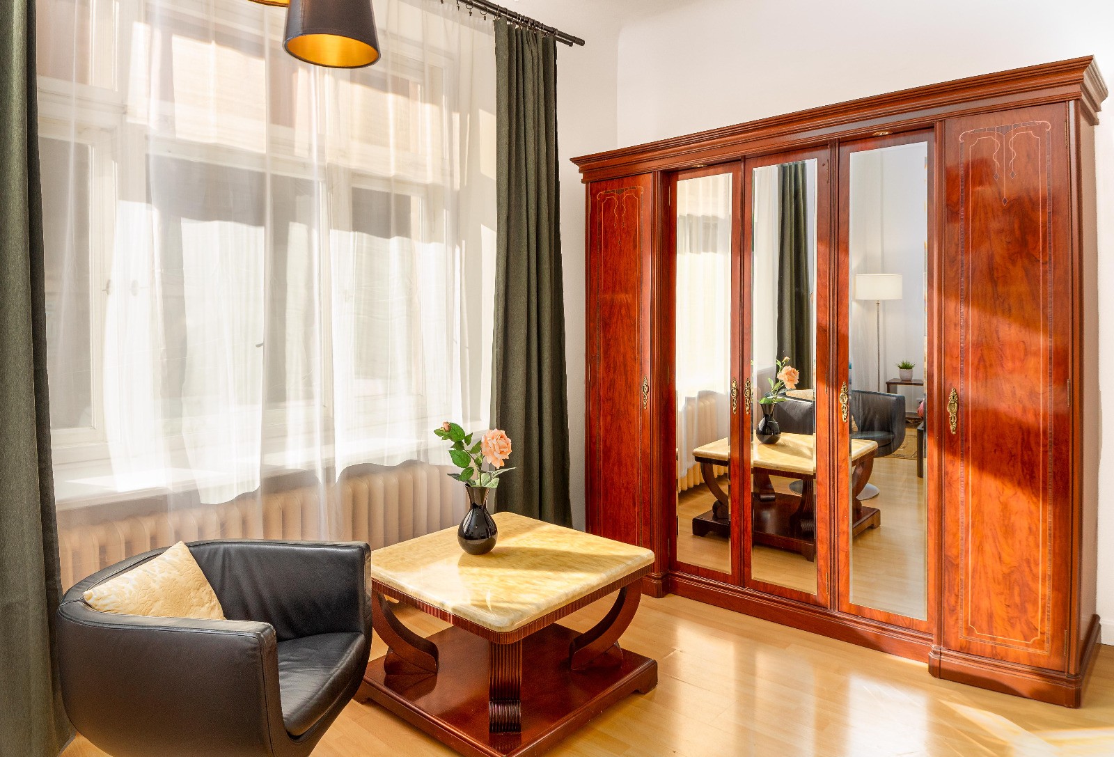The apartment is located on a high first floor in a building with a locked entrance, providing both security and privacy.