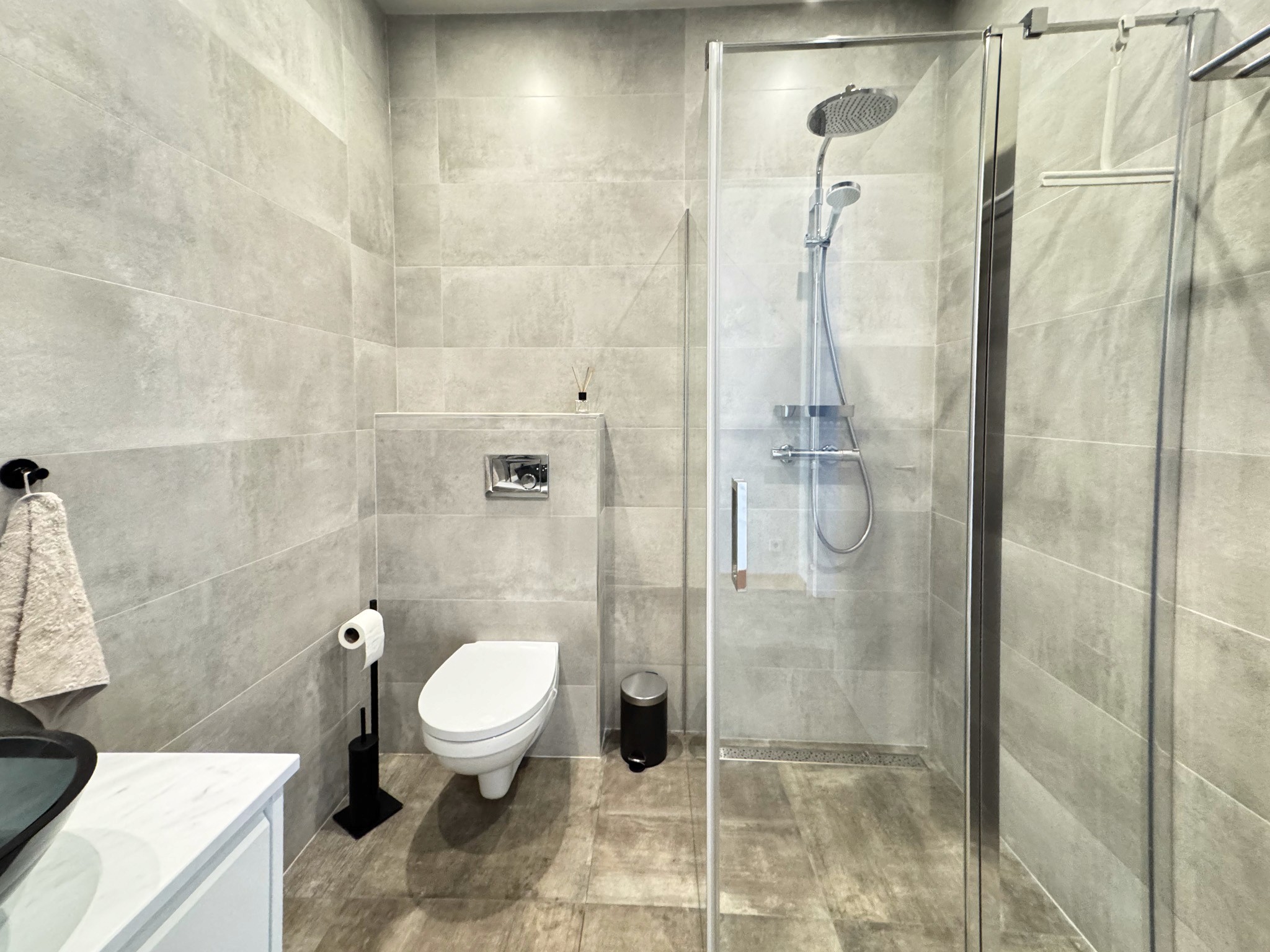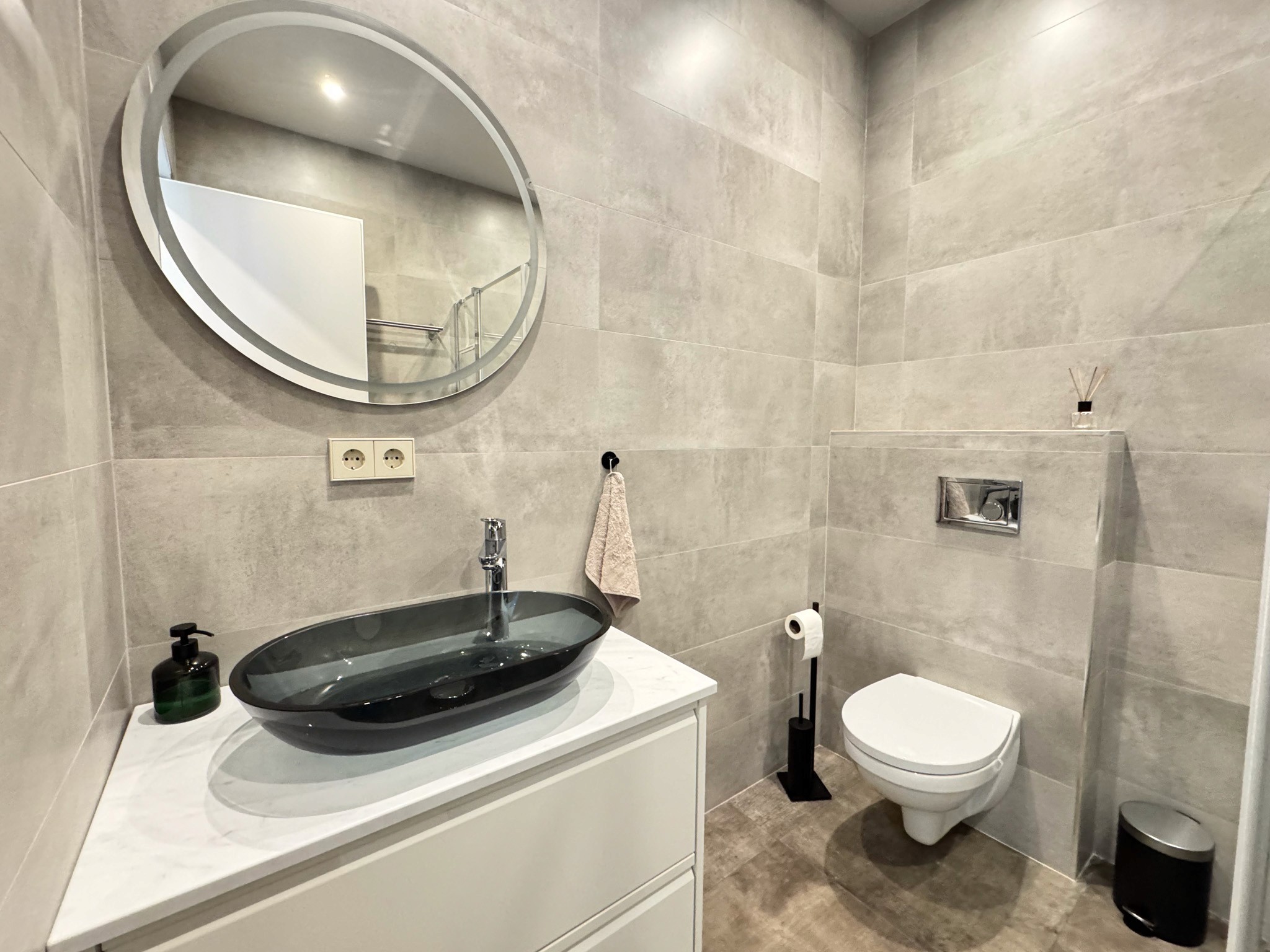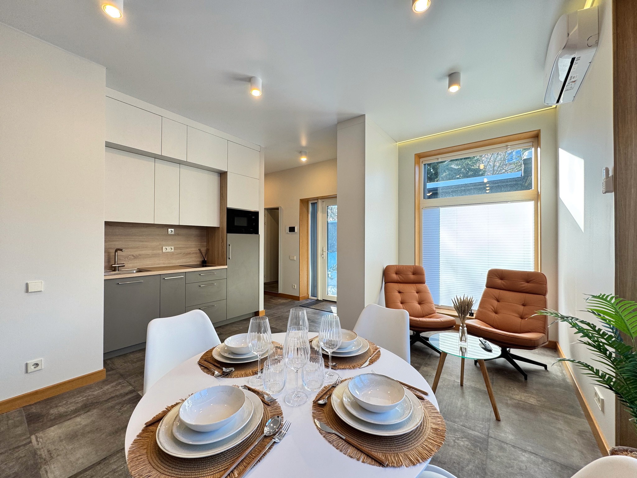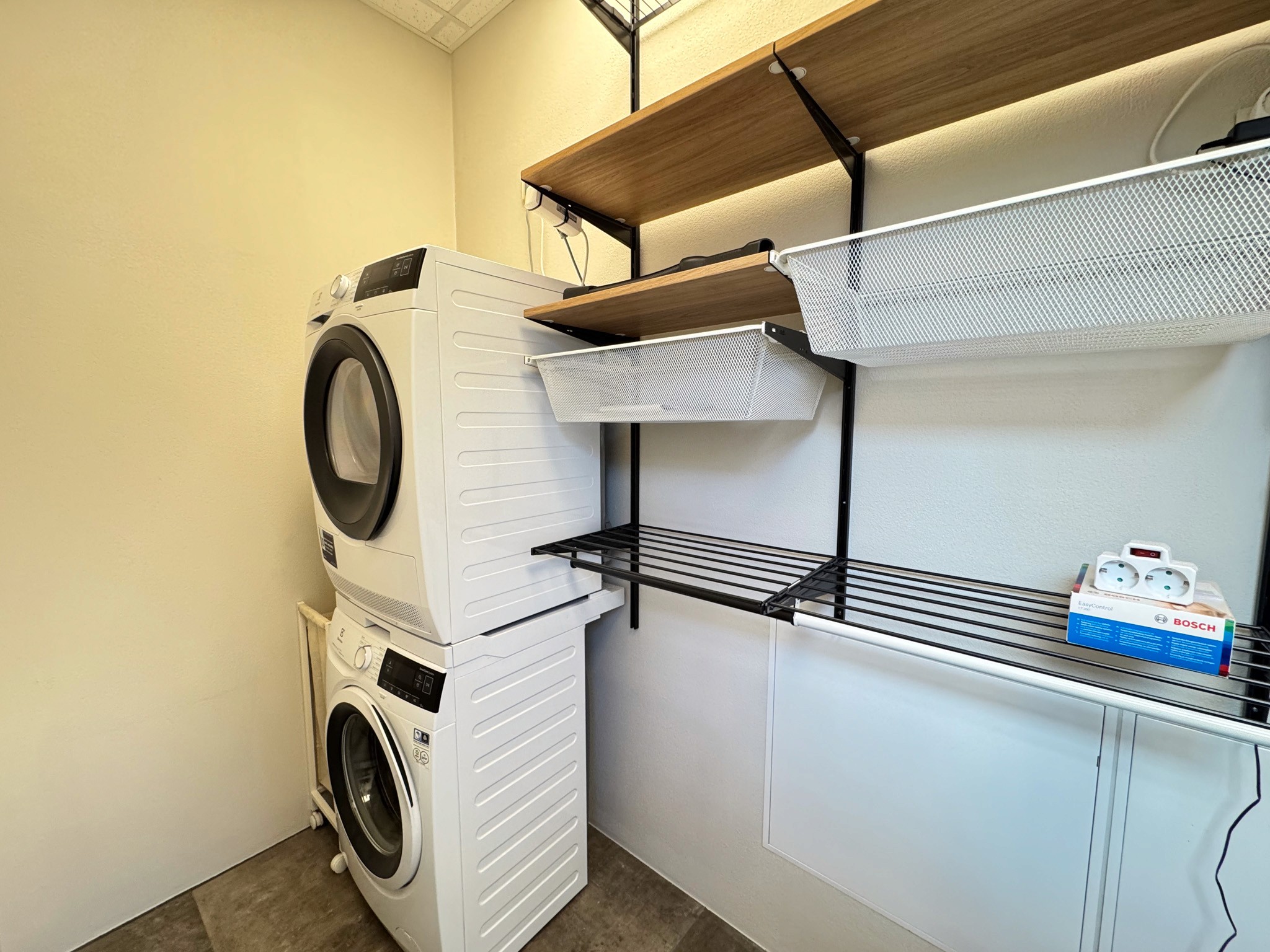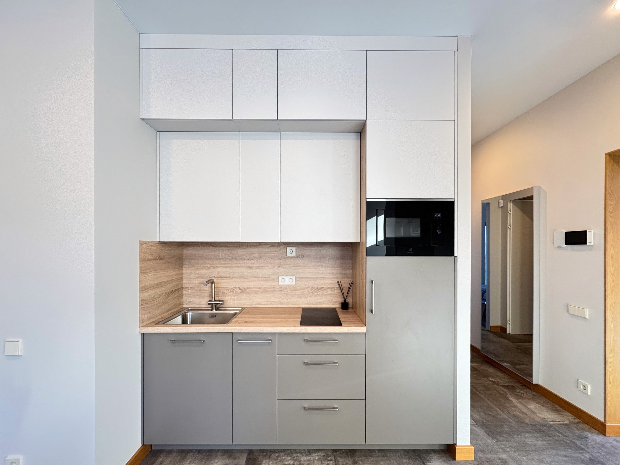 Dzīvoklī ir viesistaba, kas apvienota ar virtuvi un sadzīves tehniku- indukcijas plīti, ledusskapi, saldētavu, tvaika nosūcēju un mikroviļņu krāsni. Atsevišķa veļas telpa ar veļasmašīnu un veļas žāvētāju. Sanmezgls ar dušu un guļamistaba ar gultu un iebūvētu skapi.