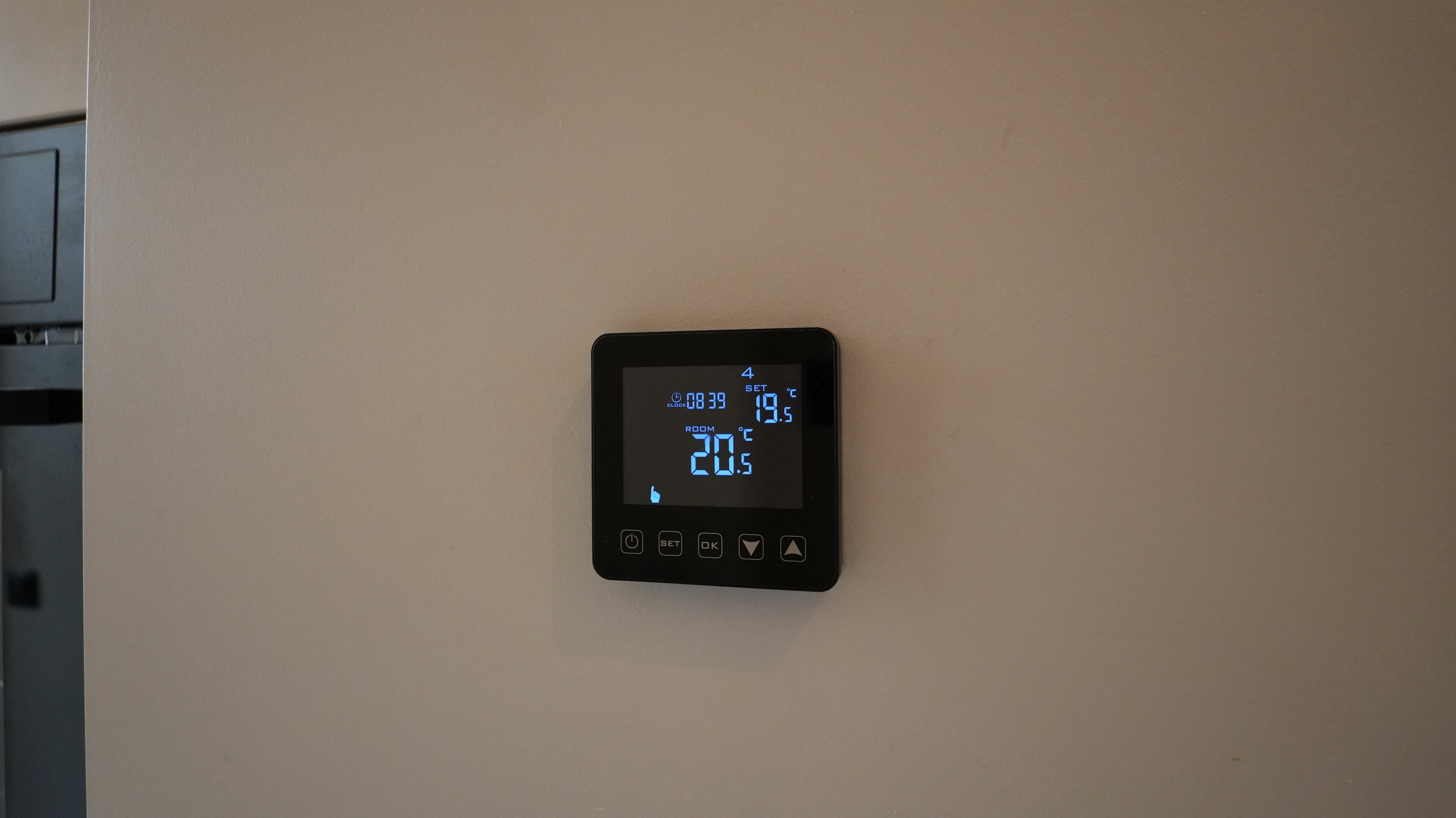 There is underfloor heating throughout the flat, adjustable separately in the kitchen and bedroom.