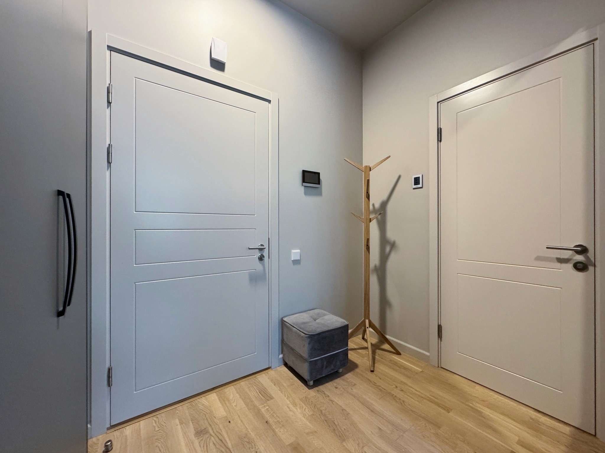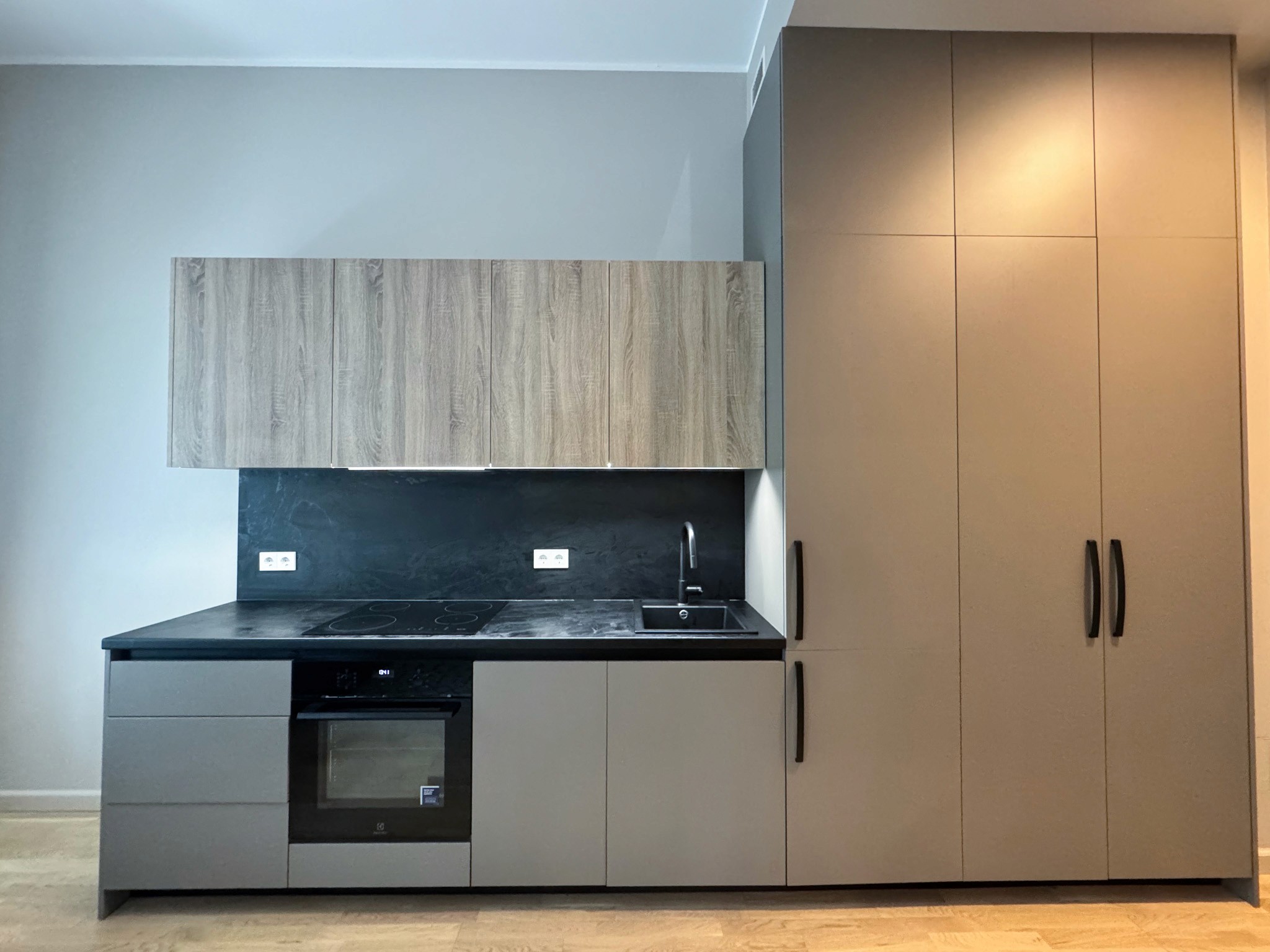 Dzīvoklis ir pilnībā mēbelēts un gatavs dzīvošanai. Viesistaba apvienota ar virtuves zonu, kas aprīkota ar tehniku- ledusskapi, plīti, tvaika nosūcēju, trauku mašīnu. Guļamistaba ar iebūvētu skapi un gultu ar mantu glabātuvi. Vannas istaba ar veļas mašīnu un žāvētāju.