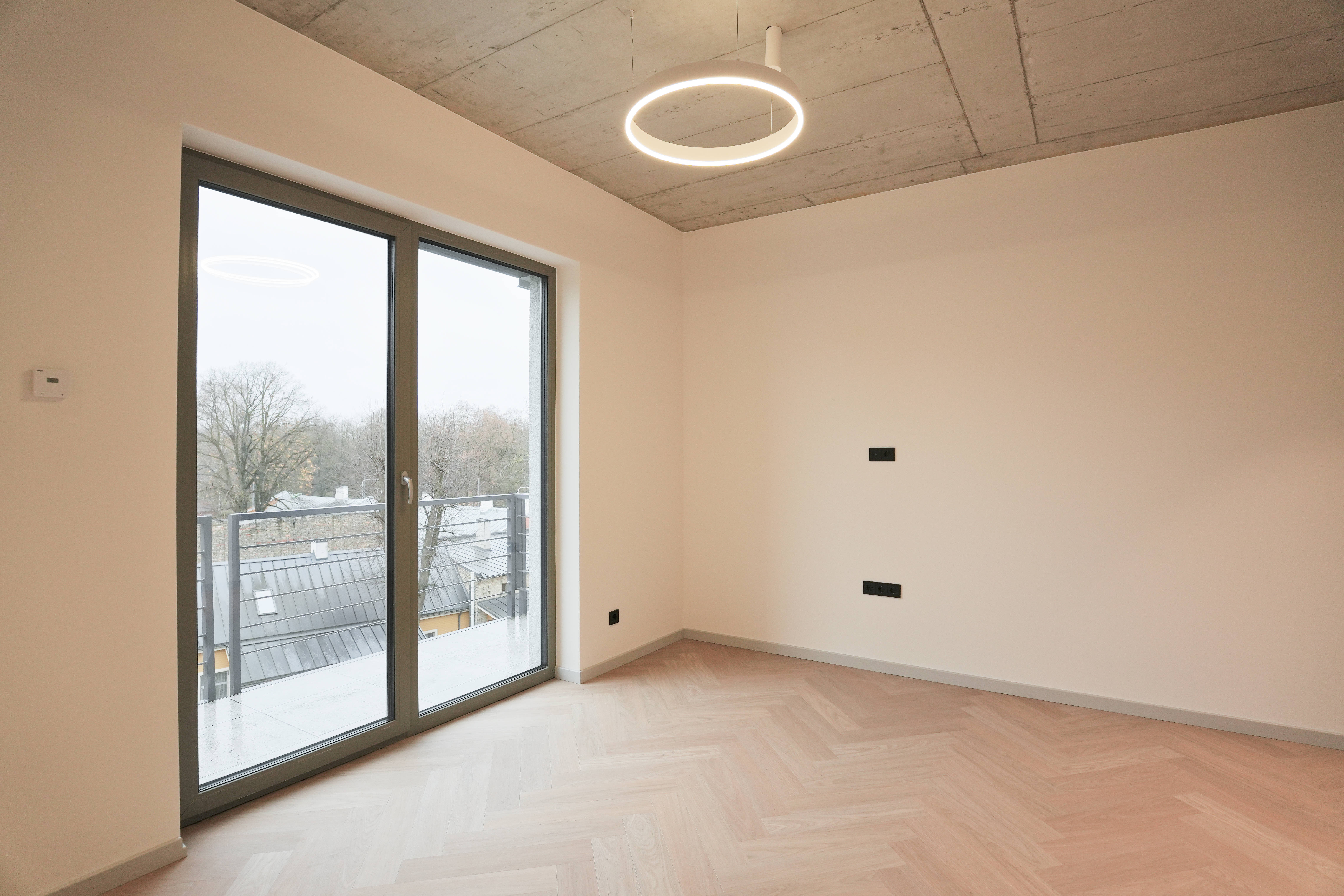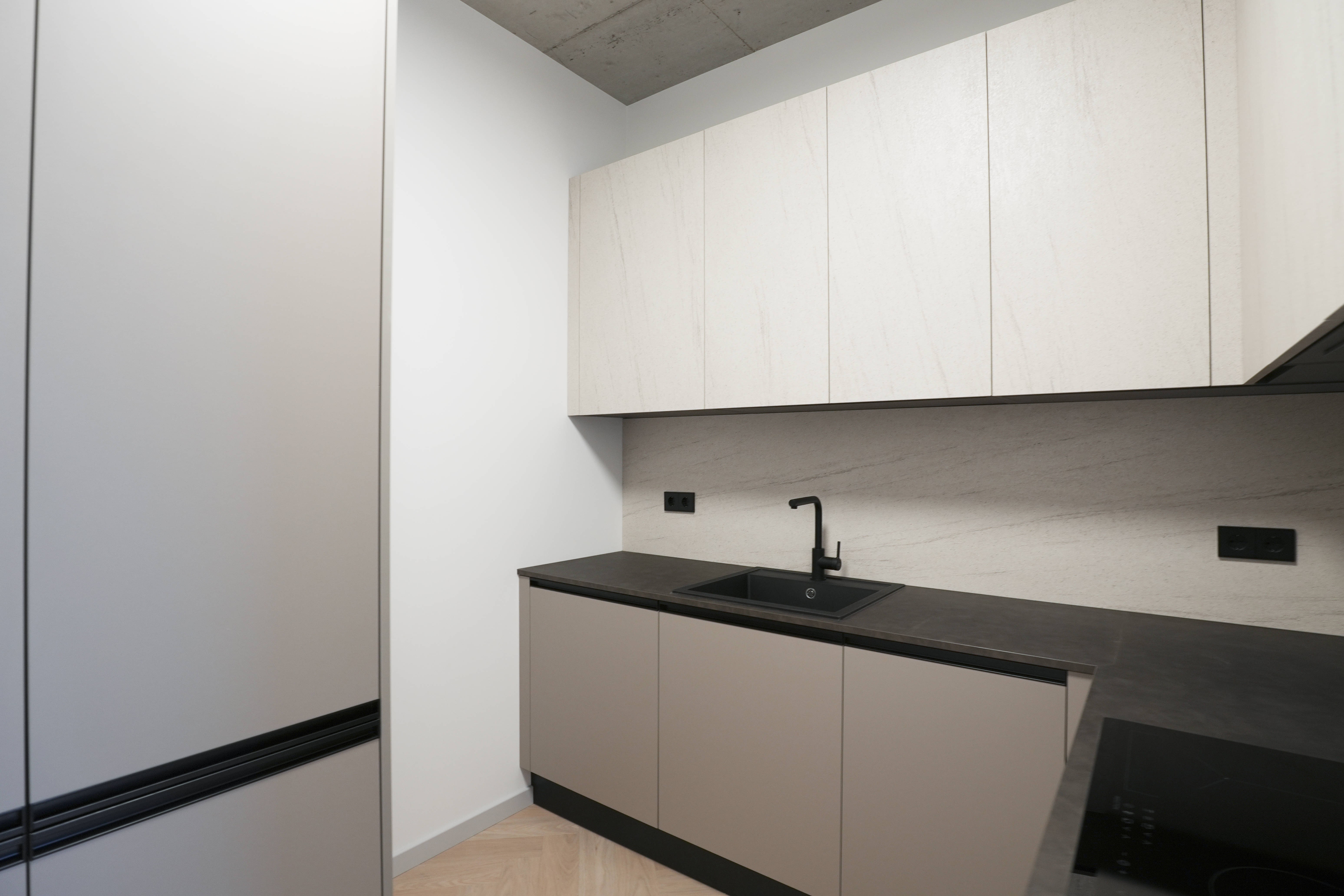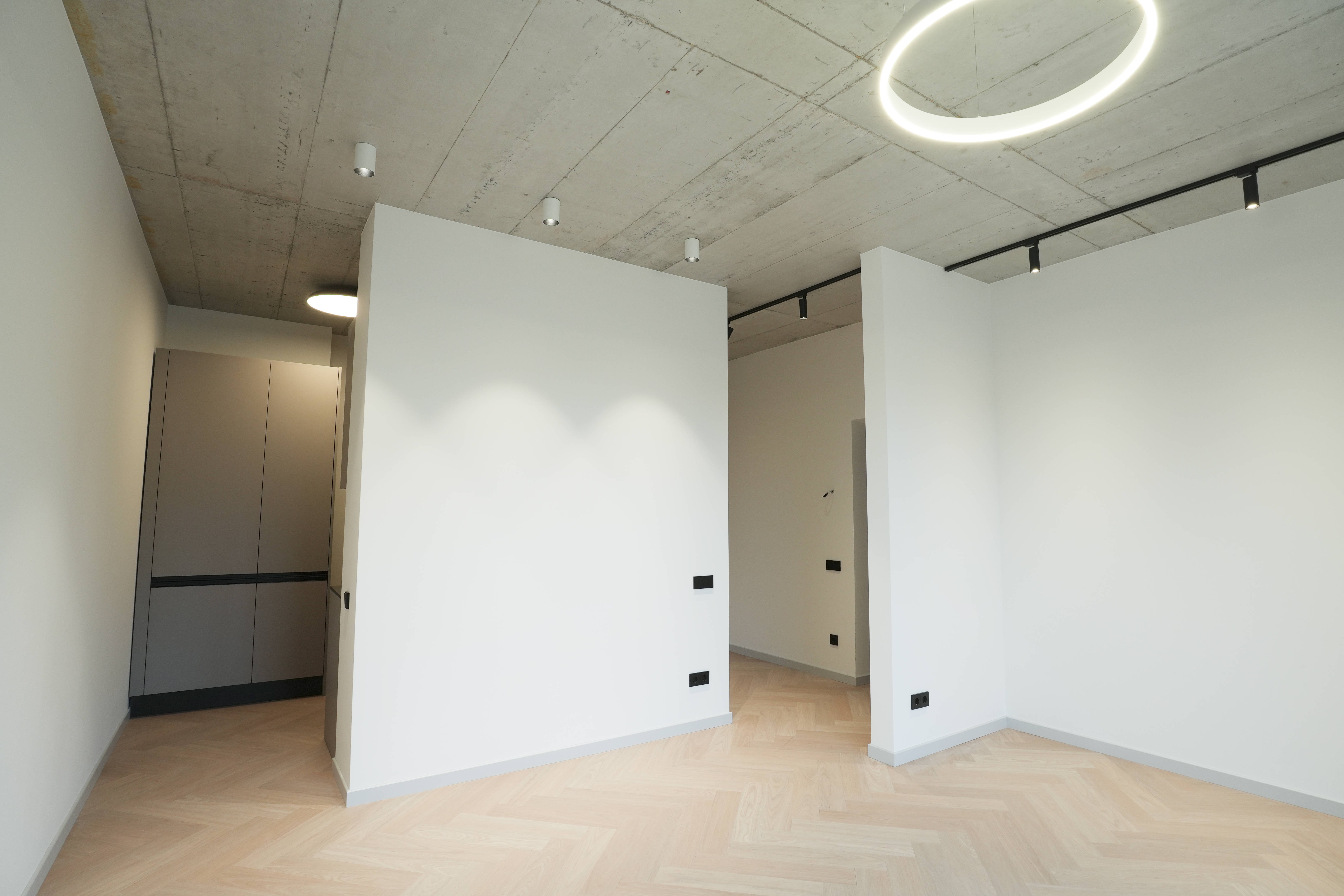 The apartment features durable vinyl flooring, "Reaton" doors with magnetic locks, excellent sound insulation, and concrete ceilings, enhancing cosiness and silence.
