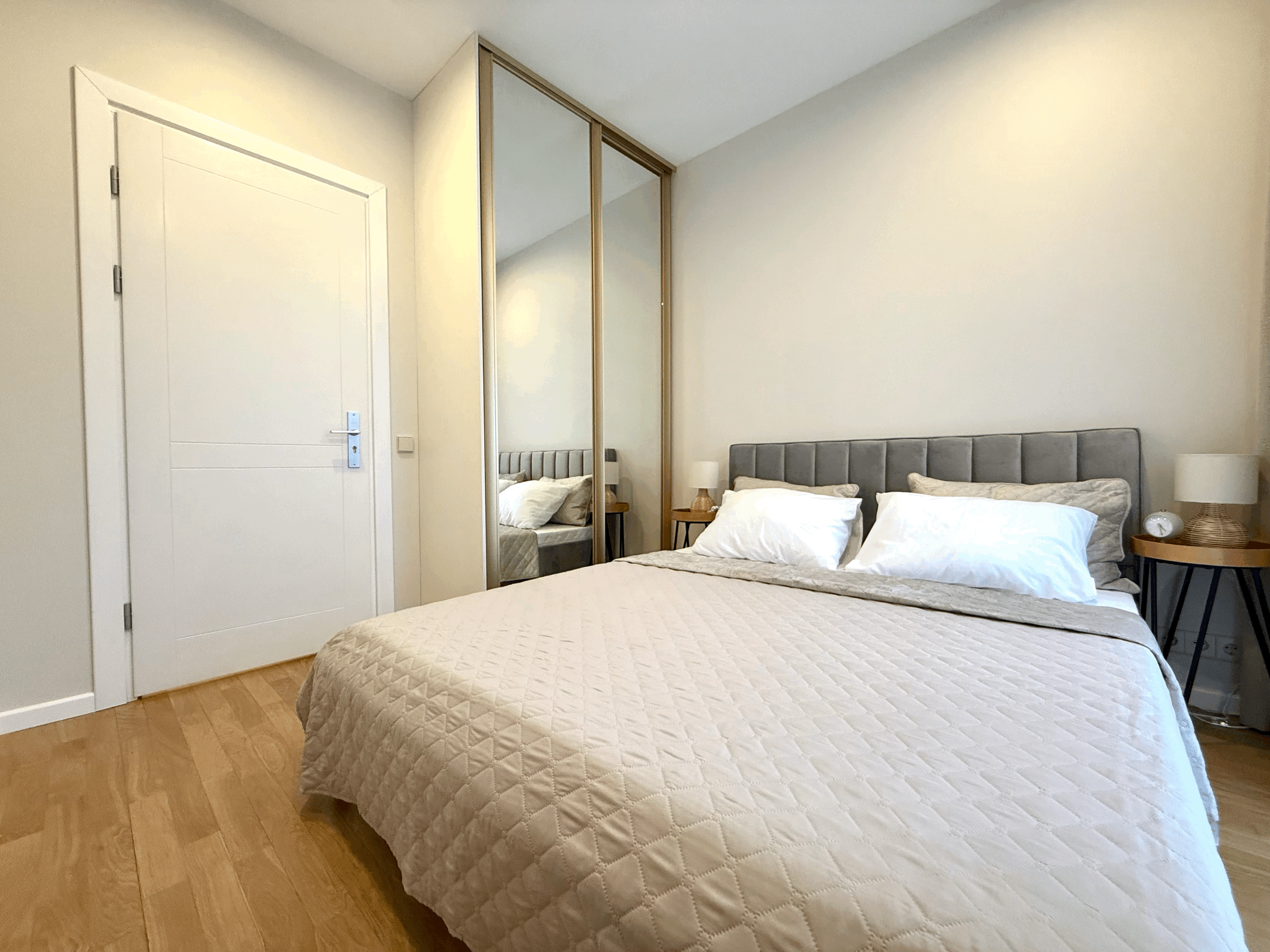 Dzīvoklī ir trīs izolētas guļamistabas (viena pilnībā iekārtota, divas pielāgojamas pēc vajadzības), plaša virtuve ar iebūvētām mēbelēm un divas vannas istabas ar apsildāmo grīdu. Dzīvoklis tikko pilnībā atjaunots un aprīkots ar jaunām mēbelēm.