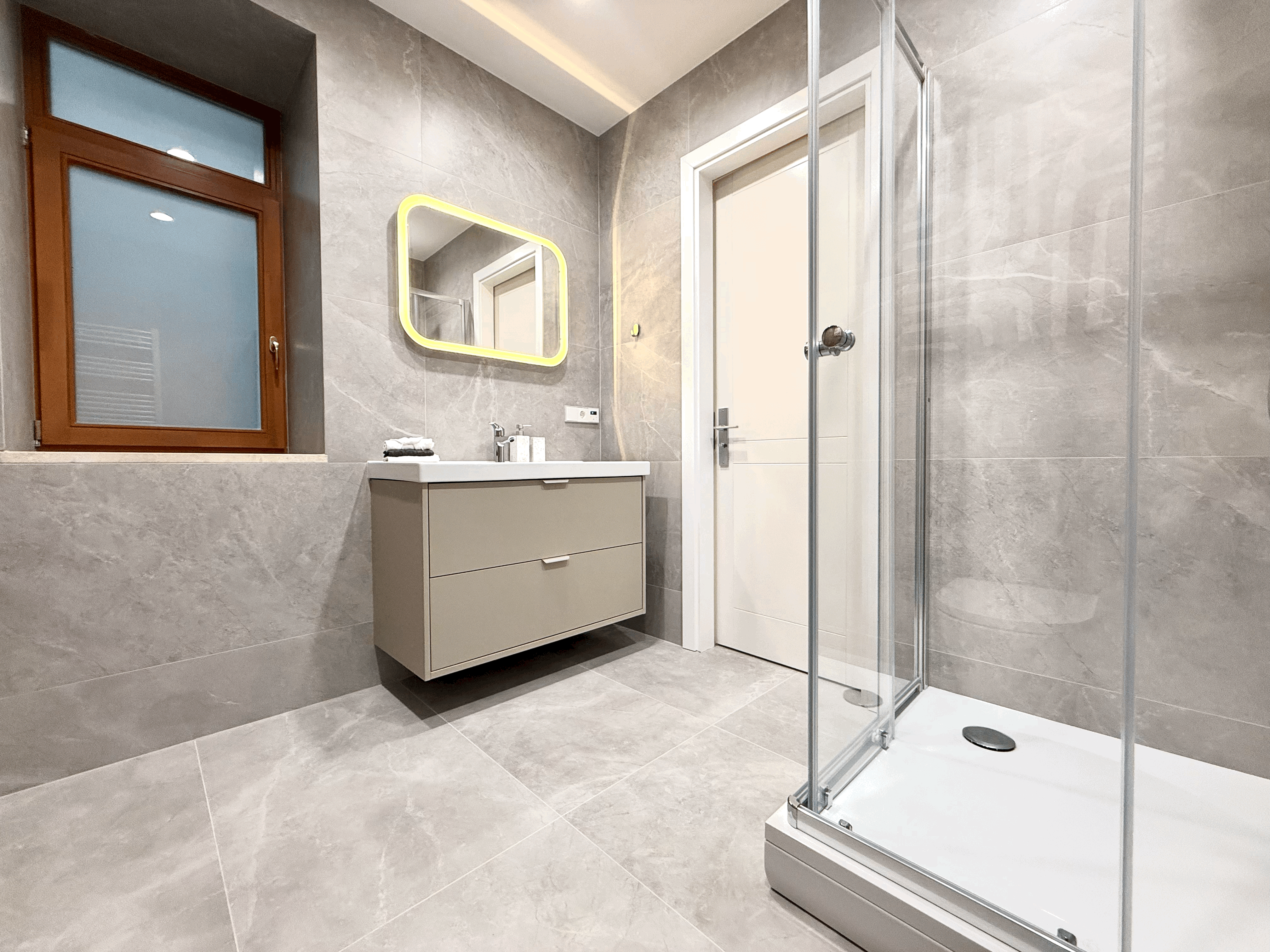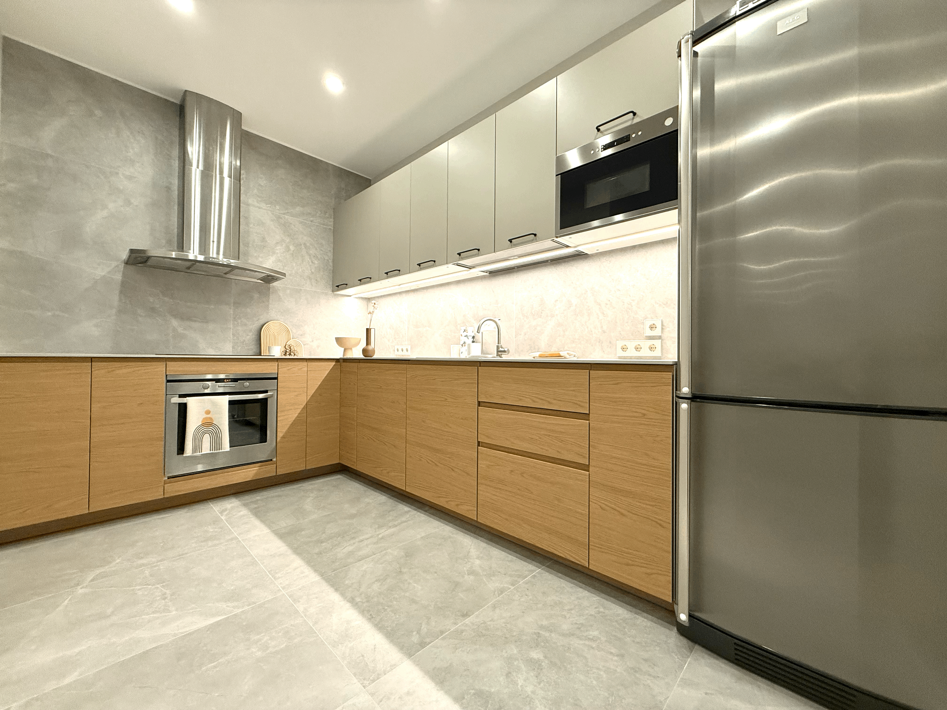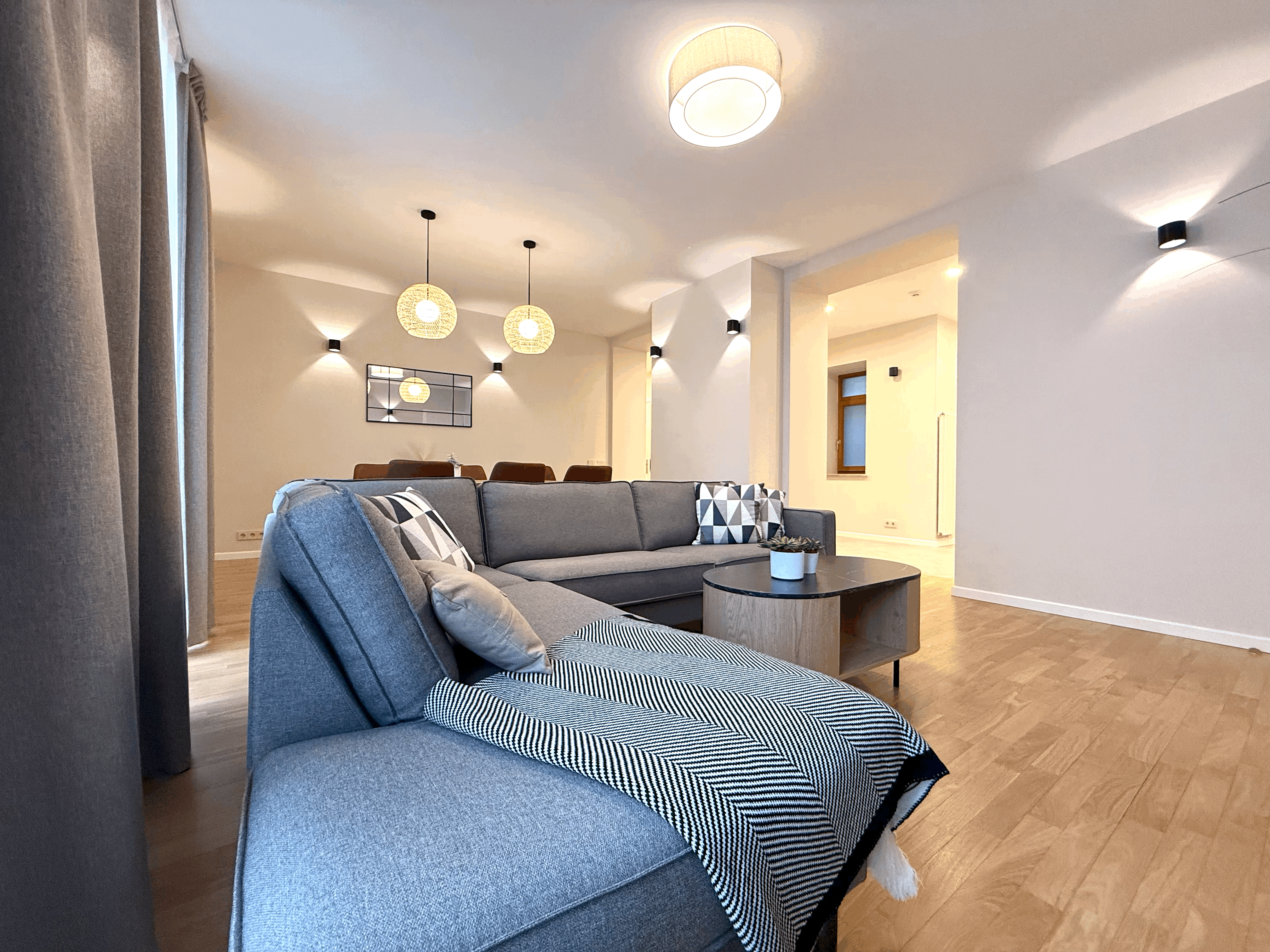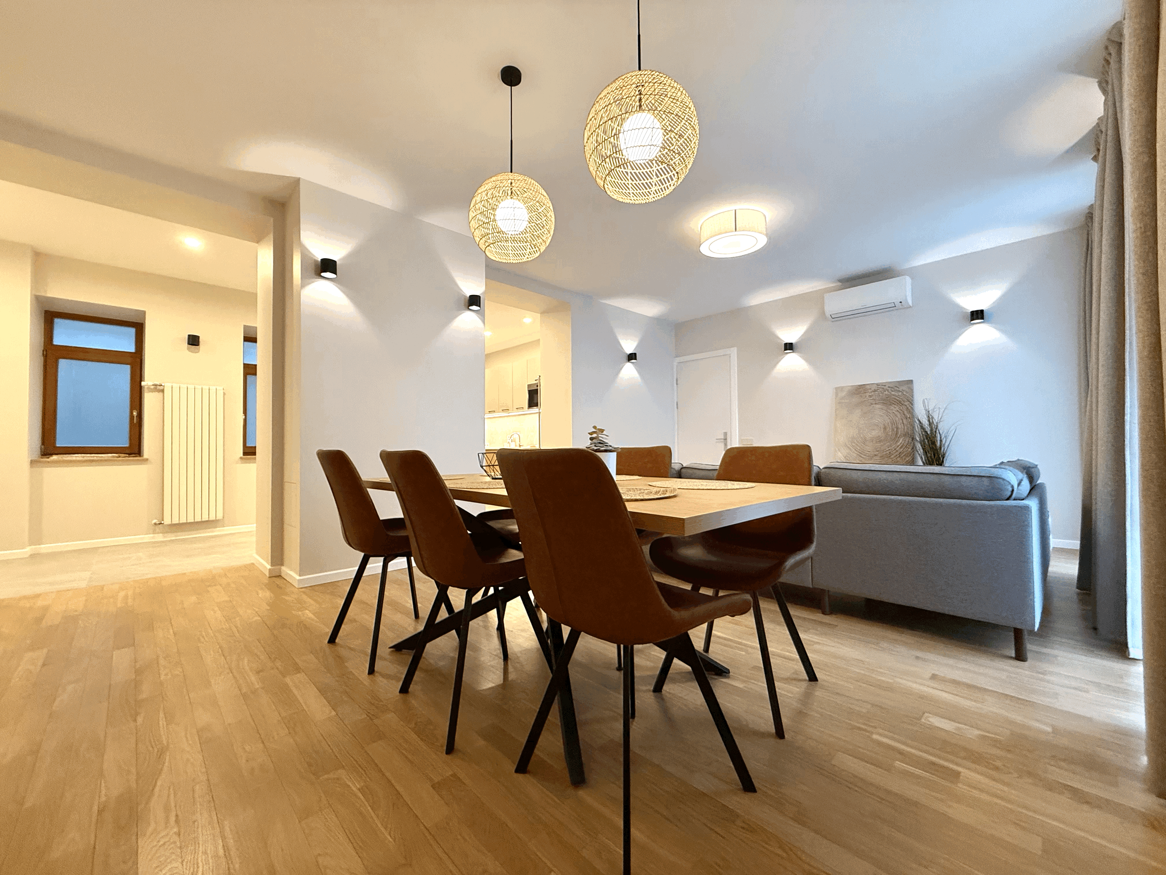 The apartment offers three separate bedrooms (one fully furnished, two adaptable to your needs), a spacious kitchen with built-in furniture, and two bathrooms with heated floors. The apartment has just been fully renovated and equipped with new furniture.