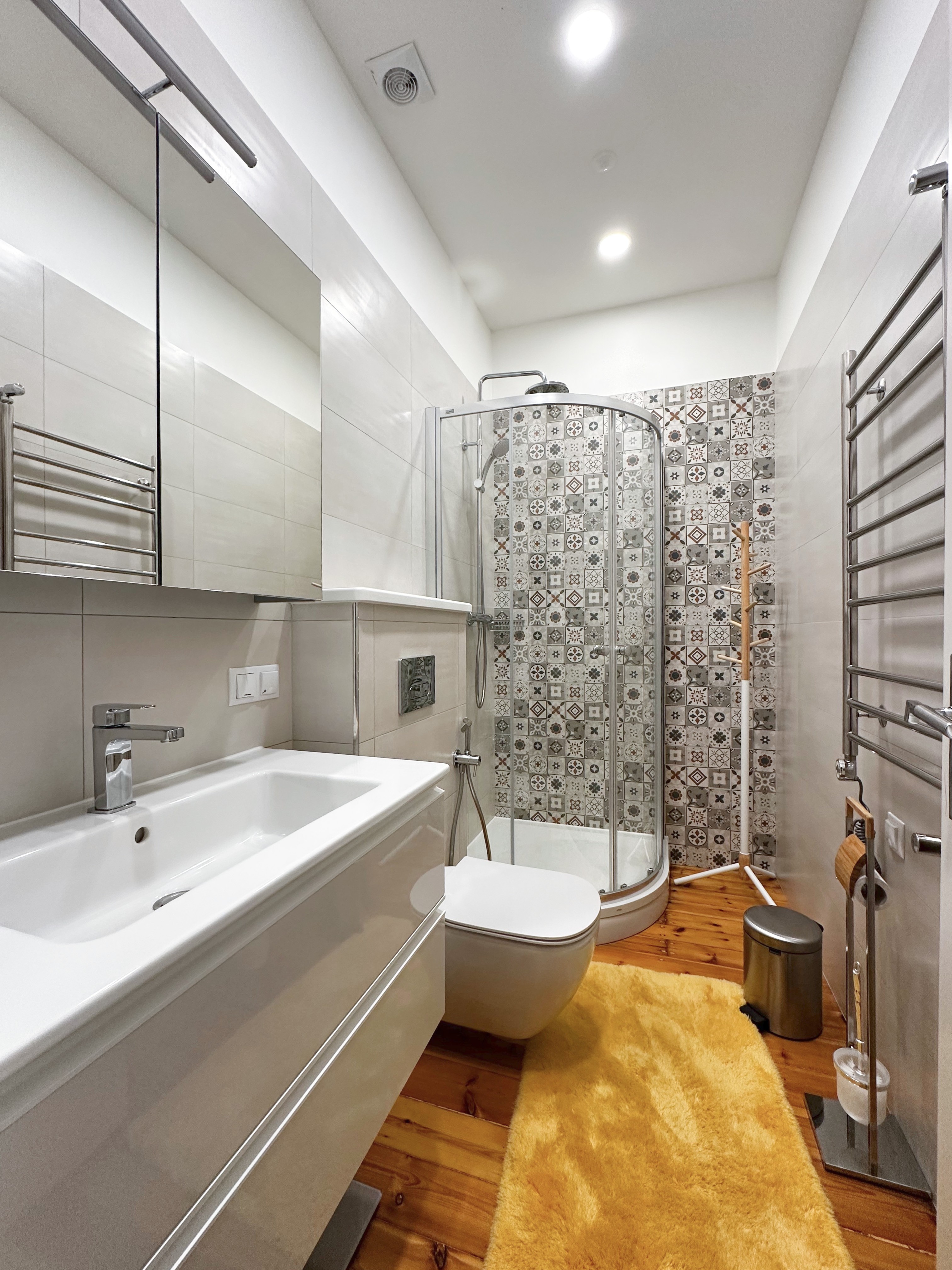 - plašs iebūvēts skapis ar lielu spoguli, veļasmašīnu